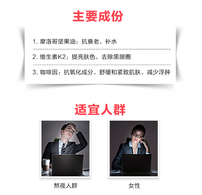 霜体冰镇触感,质地轻薄易于吸收,在配以按摩方式,加速静脉血管血液流速。具有去除黑眼圈、淡化细纹、紧致抗皱的功效,让眼部肌肤弹润细滑,快速恢复少女眼眸~