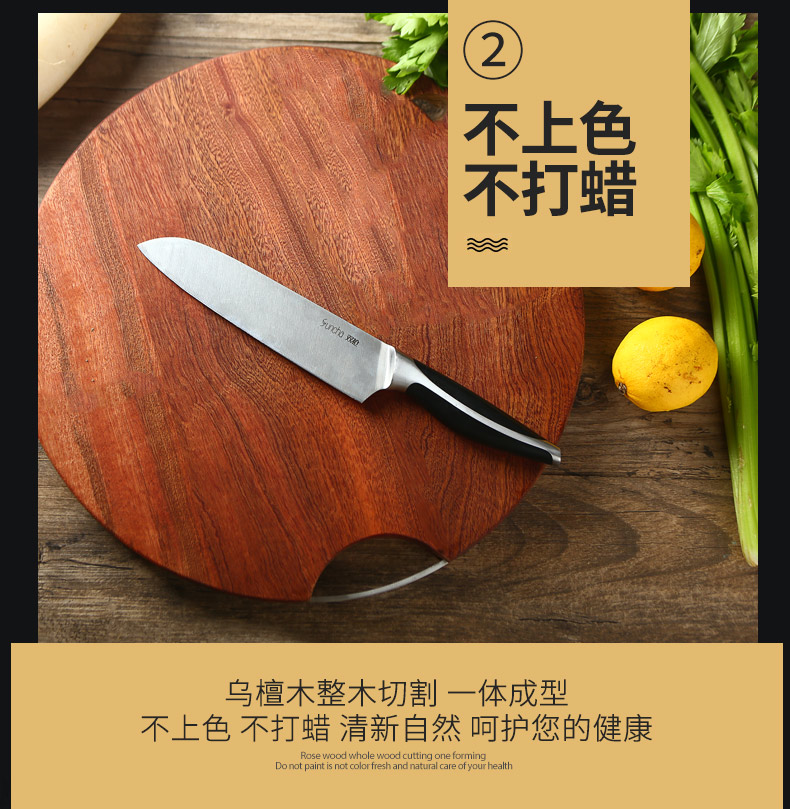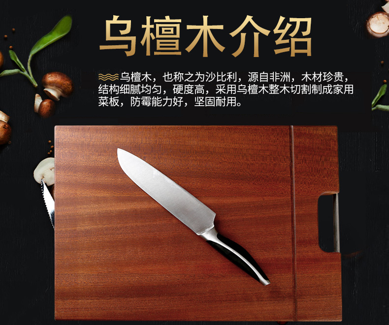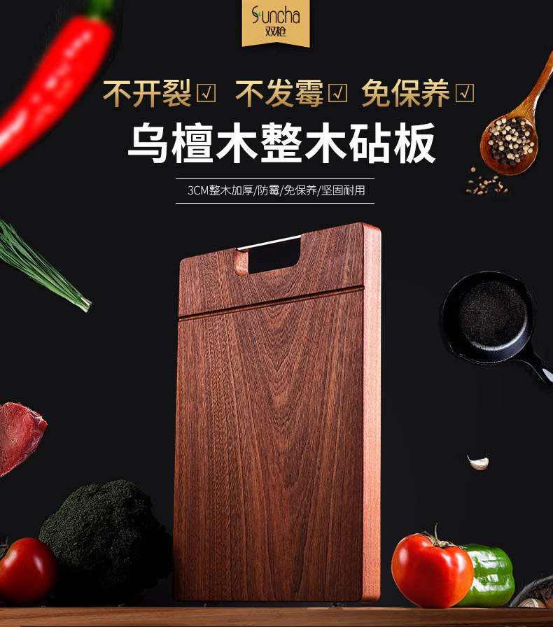 非洲是乌檀木的主要产地,其中整木制作的乌檀木菜板,无拼接无胶水,也就没有甲醛,安全放心。这款双枪砧板,采用进口整块乌檀木,无拼接无胶水,3厘米加厚,防霉能力好,坚固耐用。