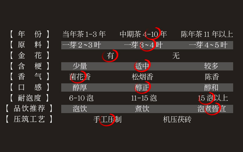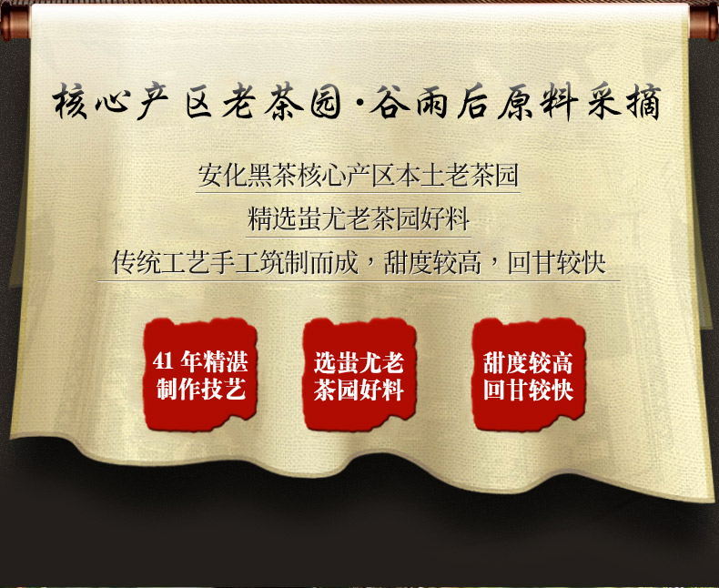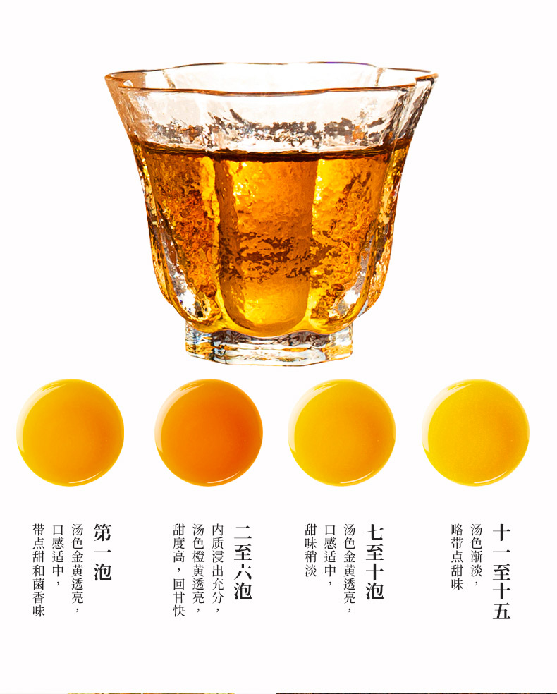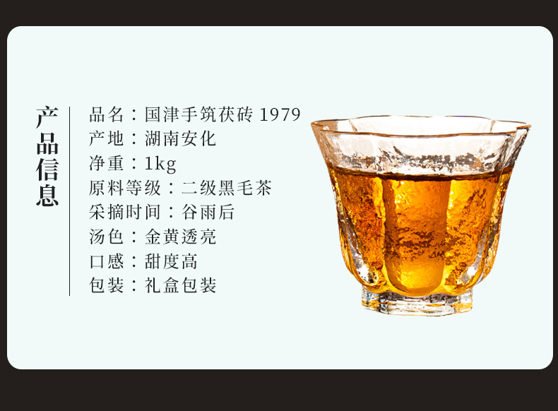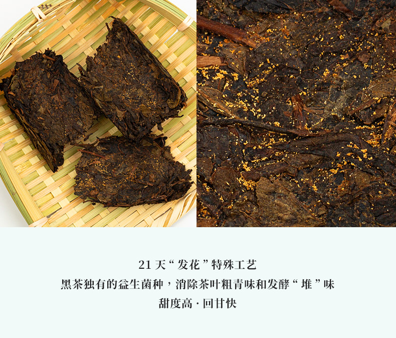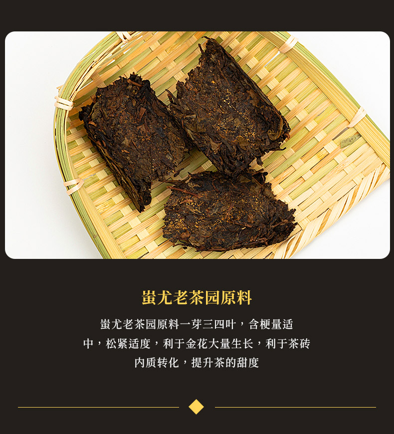 这款金花茯茶,由茯砖茶撬散而来,以安化黑毛茶为原料,传统工艺纯手工工艺恒温发酵,干茶乌黑温润,金花饱满茂盛,汤色红浓油亮,滋味醇厚绵滑、回味甘甜。