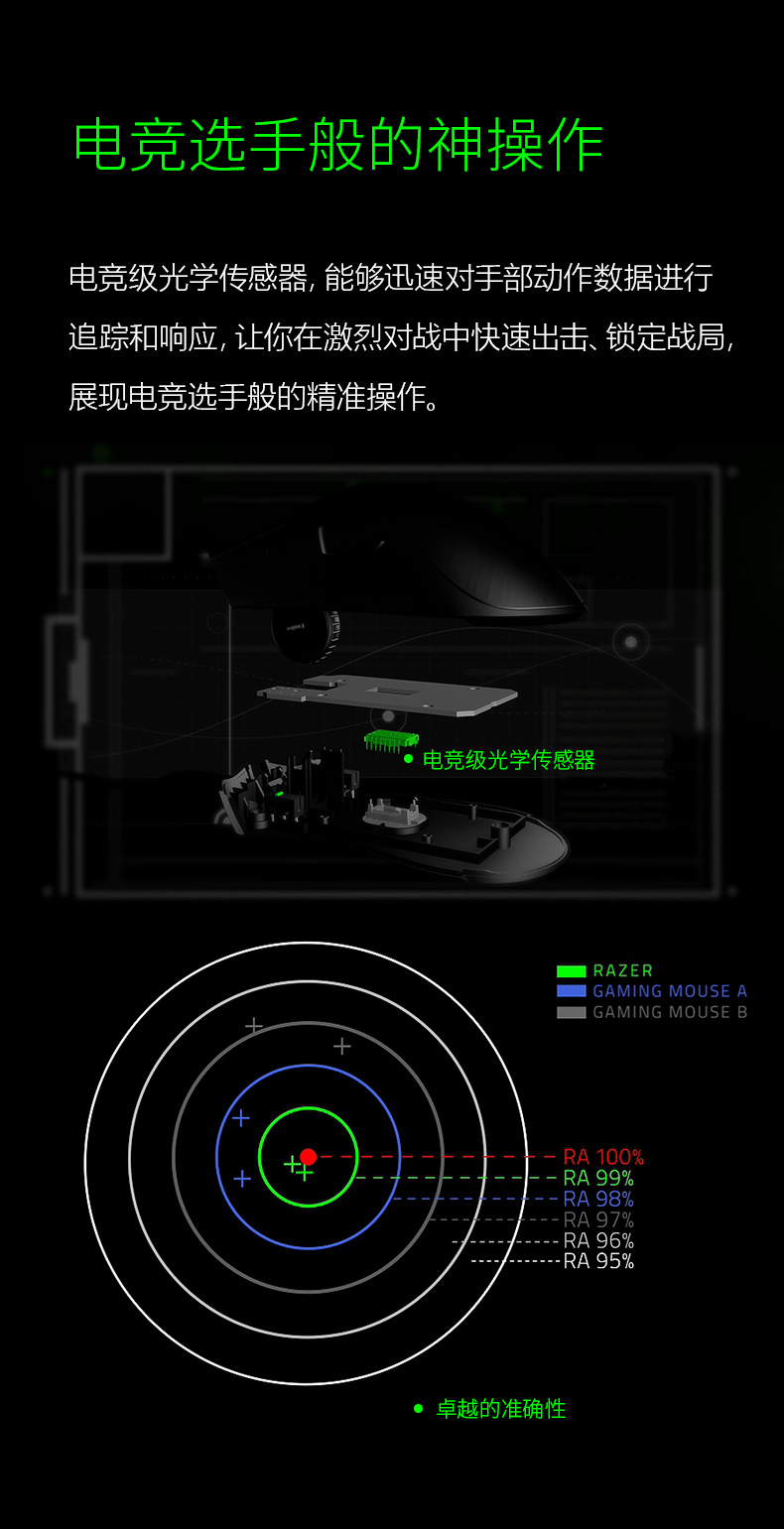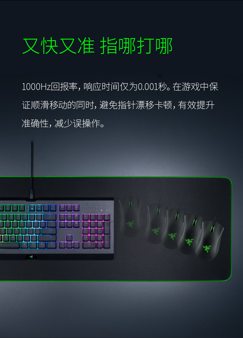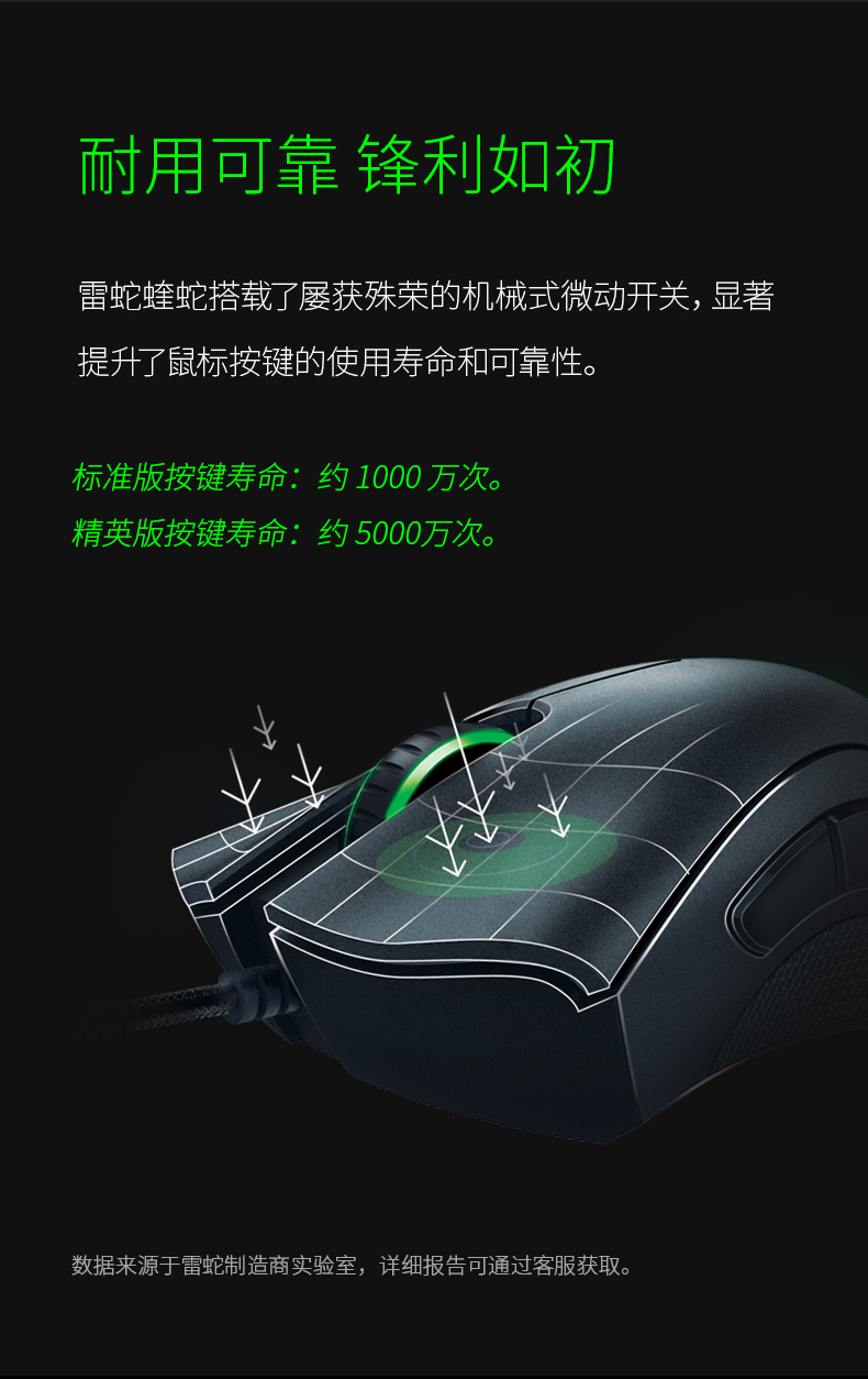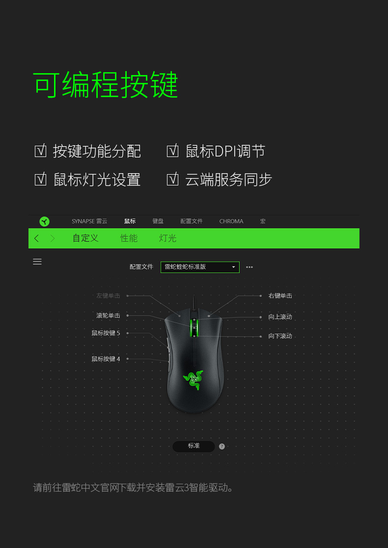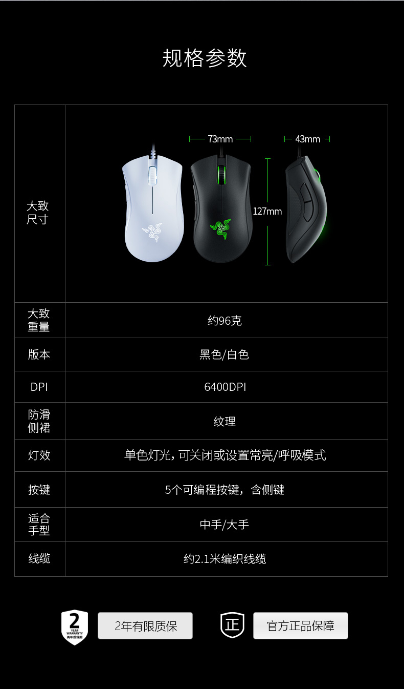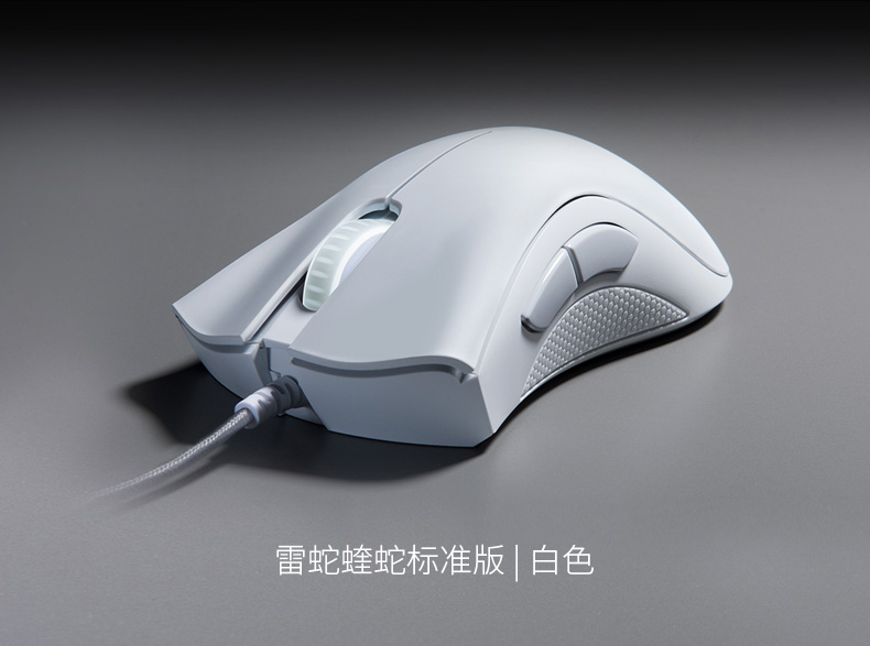 右手型设计,5个可独立编程按钮(2个侧键),以及雷蛇招牌的呼吸灯设计。涂层为磨砂的类肤材质,不仅避免了打滑而且更加耐脏。鼠标两侧使用了防滑橡胶涂层。脚贴材质为更加顺滑的UPE(超高分子量聚乙烯,耐磨性4倍于聚四氟乙烯),驱动也有自己的专属版本,是一款颇具性价比的入门级游戏鼠标。