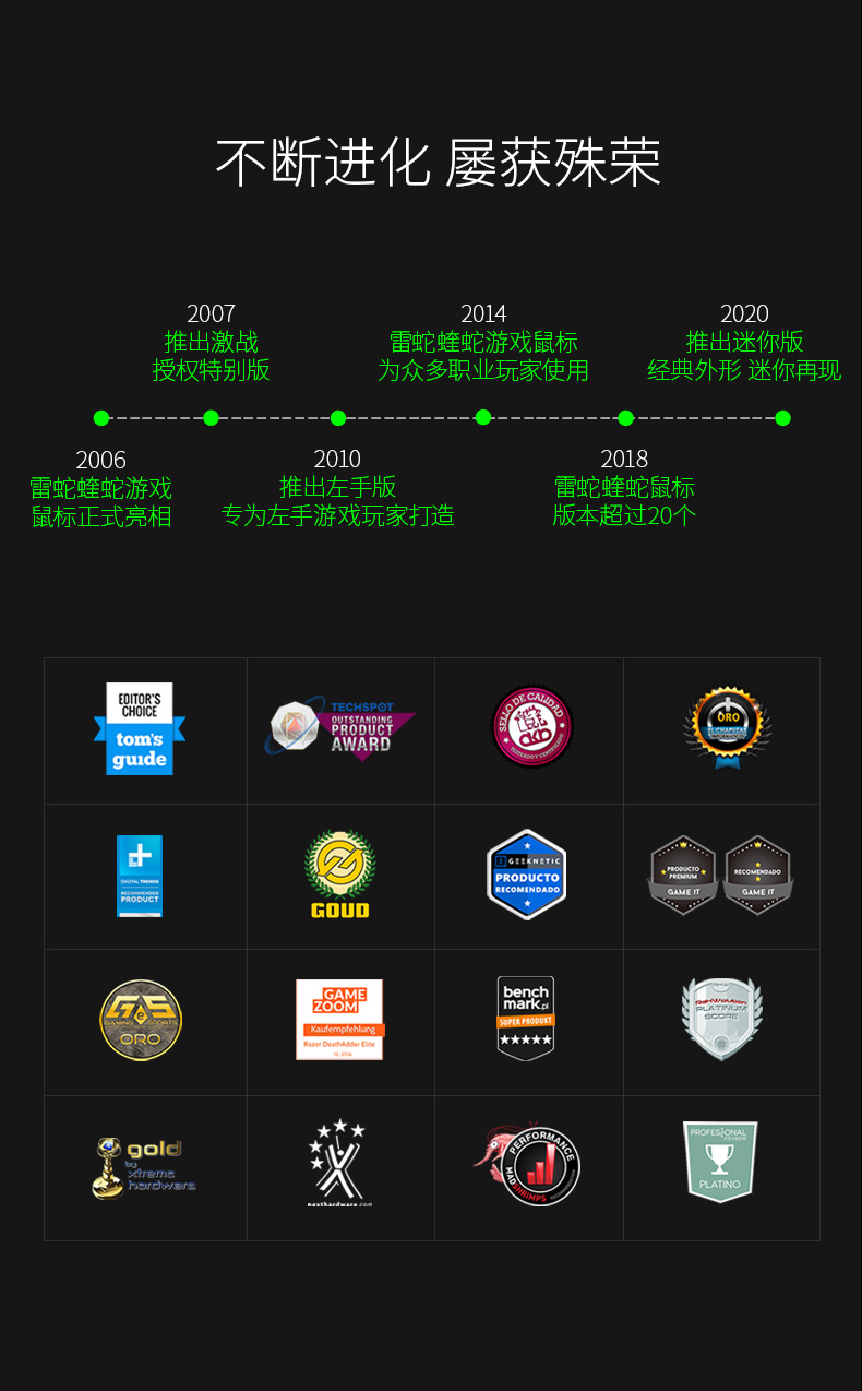 Death Adder 炼狱蝰蛇是雷蛇的经典游戏鼠标,自2006年起推出了多个版本,不断打磨迭代。2013版炼狱蝰蛇采用了6400dpi的4G红外传感器,支持Razer Synapse 2.0。