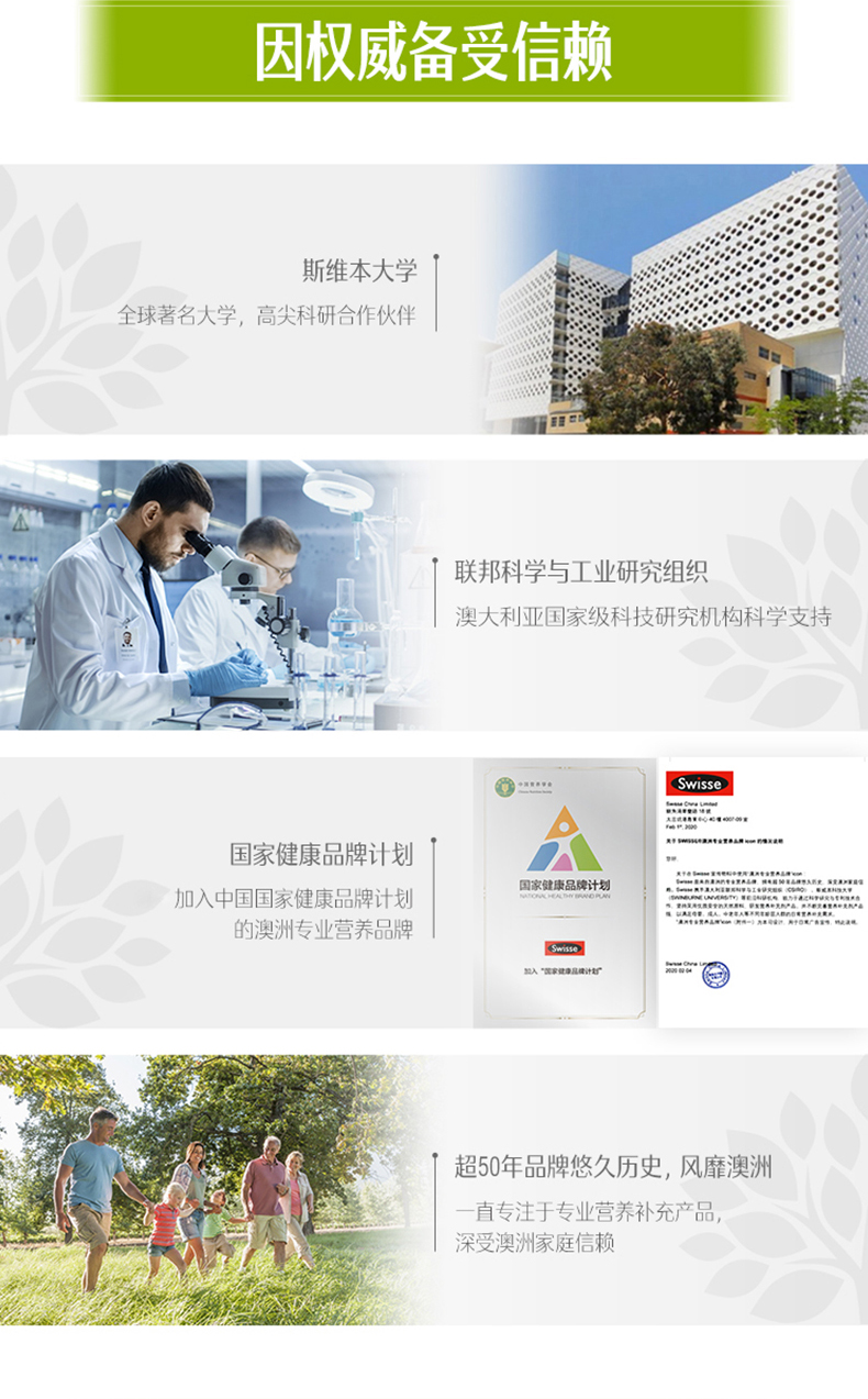 Swiss是近两年风头很盛的自然健康品牌,于1960年在澳大利亚墨尔本创建,号称澳洲顶级保健品,同时也是澳洲自然医学疗法的先驱之一,公司主旨是倡导缔造健康和高品质生活,有超过25年的科学研究和临床试验的基础,其原料采购和生产工艺均通过全球最高处方药的生产标准TGA。