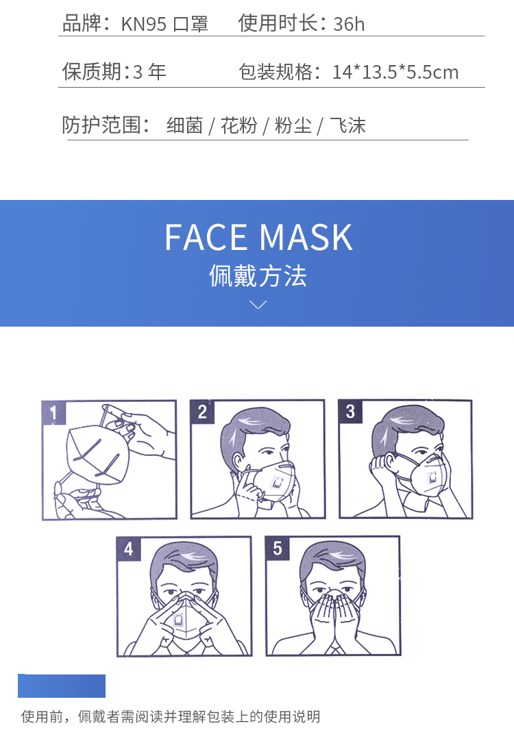 这款口罩由安徽久之林医疗科技有限公司生产,正规医疗企业,遵循国标GB2626-2006,品质靠谱。5层结构的防病毒口罩,内含熔喷布,顶部有金属塑形条,KN95级别,能运用在大部分公共场合。领券链接点此