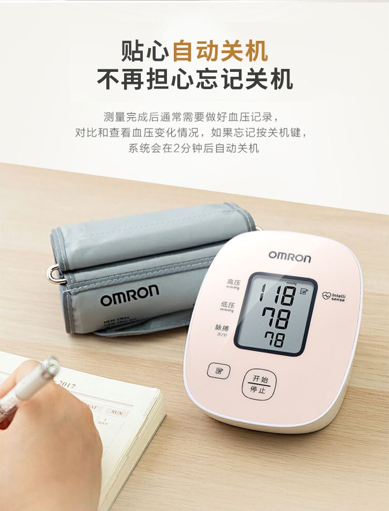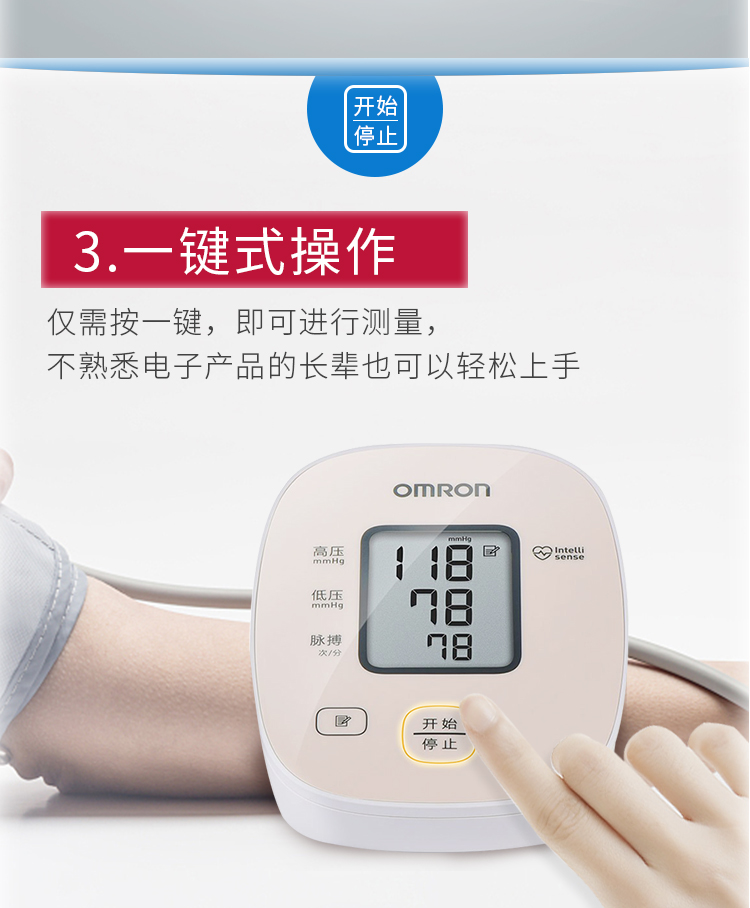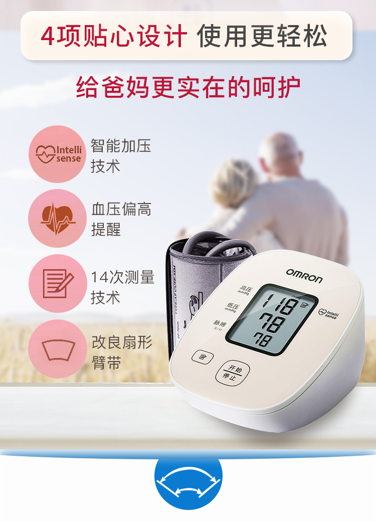 内置特有intellisense核心生物传感技术,根据被测量者的血压情况自动调节加压力度,实现缩短测量时间,搭配改良过的扇形臂带,提高测量舒适度,确保结果更加准确,最多记录14次记录数据,具备高血压自动警示功能;