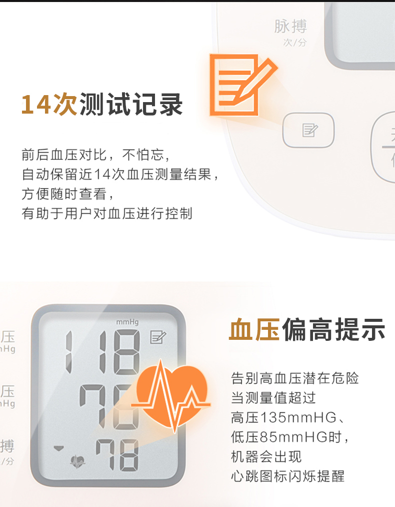 袖带自检,可以提示佩戴者佩戴的位置是否正确,提高检测的准确性;带有错误警示灯,在血压测量的过程中,略微的身体移动会造成错误血压值的产生,屏幕会显示误动作标志,重新测量后获得正常数值;血压计作为家中常备简易医疗设备之一,非常适合有老人的家庭使用。