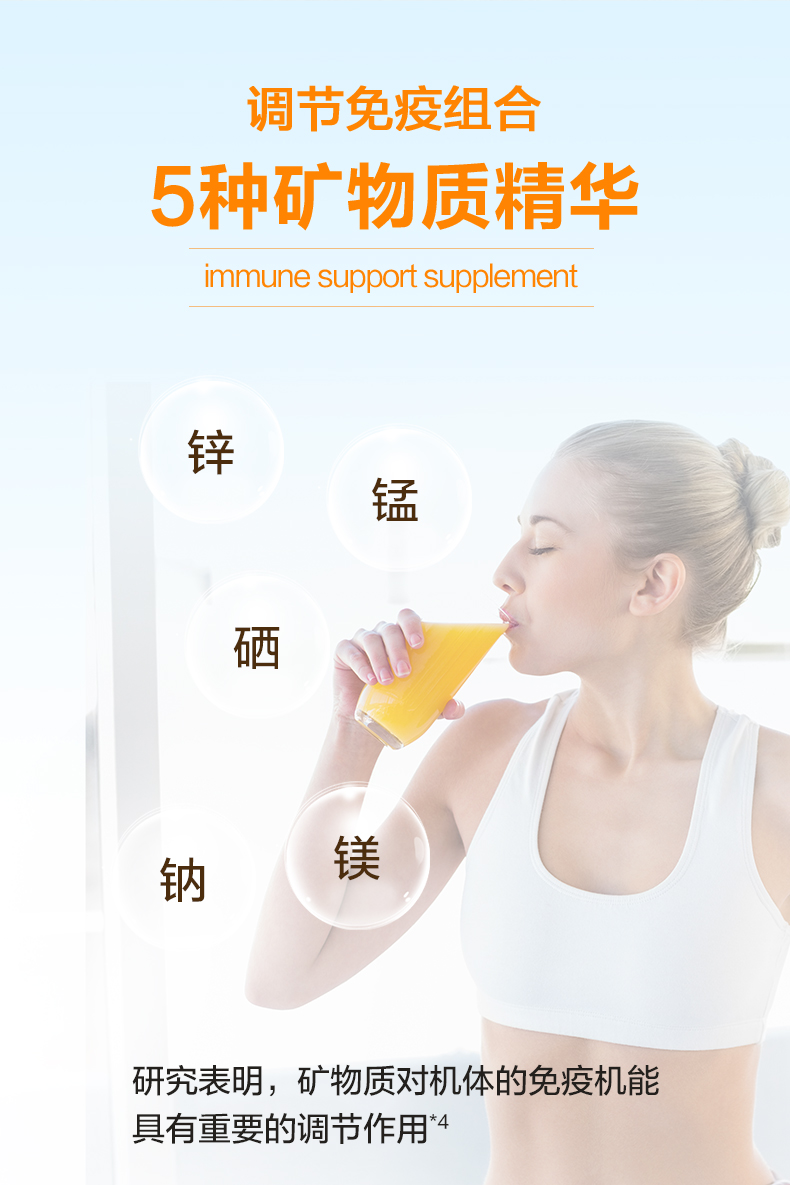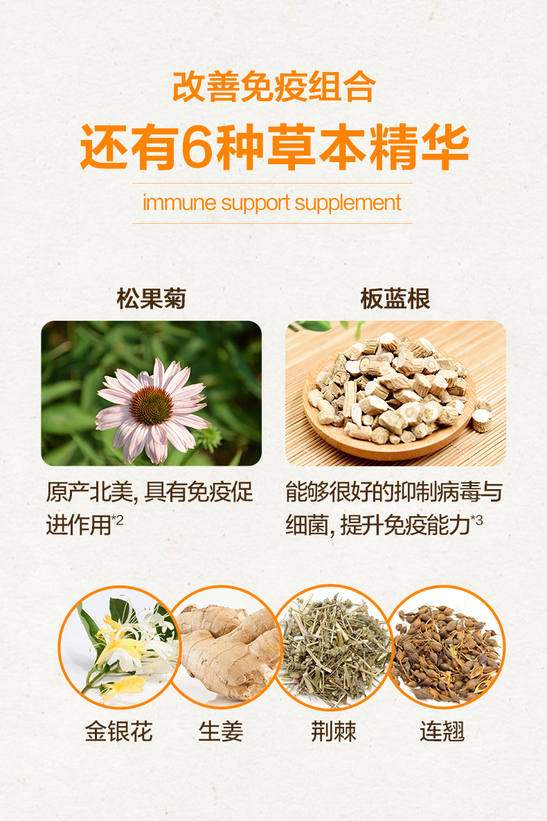 Airborne的这款复合维生素咀嚼片,主要成分是维生素A+C+E,每片含600mcg维生素A、1000mg维生素C、13.5mg维生素E,人体所需微量矿物质元素(40mg镁、8mg锌、15mcg硒、40mg钠、3mg锰),另外还含35mg草药成分(金银花、荆棘、连翘、生姜、荆条、板蓝根、紫雏菊提取物等),通过科学的配比制成,橙子味,食用味道不错。