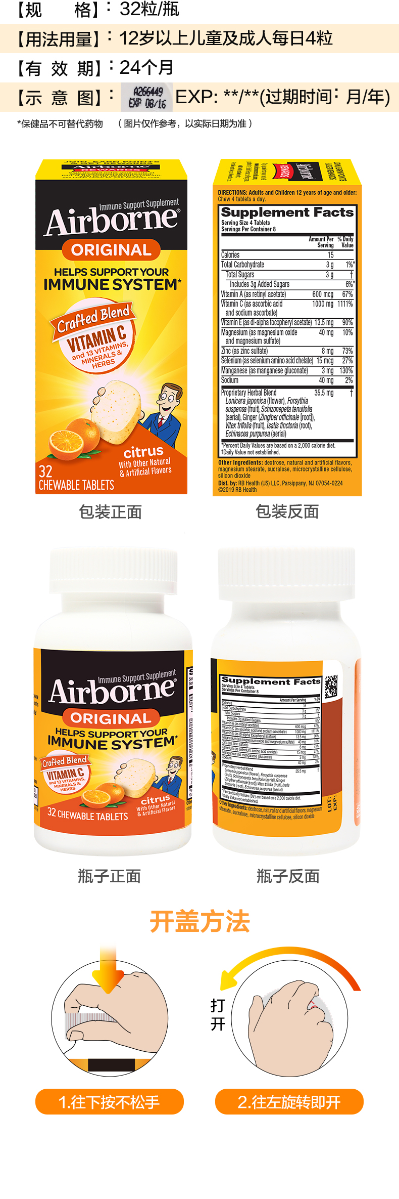 一片Airborne=510粒樱桃=13个猕猴桃=20柿子=1.7颗西兰花=75粒草莓。维生素A可以改善皮肤粗糙的状况,有助于身体减少自由基的伤害。维C能够提高人体的免疫力,降低感冒的风险。维生素E具有很好的抗氧化作用,是女性美容所需的抗衰老营养品。