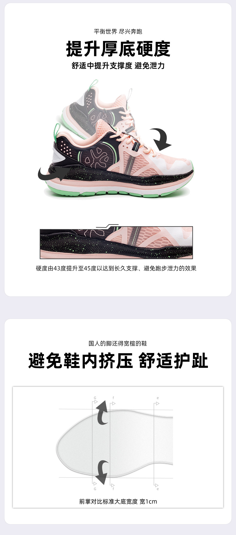 中底使用炫彩工艺制成的珠光喷漆,外观时尚靓丽。鞋楦优化了前脚掌宽度,鞋面包裹脚掌,使脚步受压更均匀。