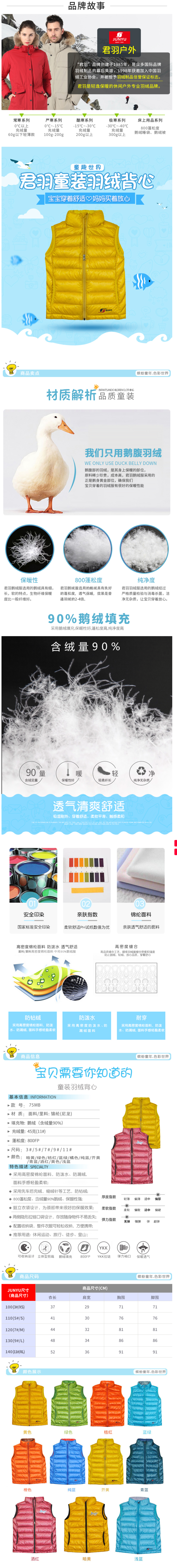 这款君羽儿童超轻羽绒马甲,内里填充800蓬90%鹅绒,充绒量45克(11#码/140),从充绒量上来说属于薄款,但儿童的身材个头较小,羽绒的蓬松度也高,不会降低保暖性能,还会令羽绒服更轻。外层是高密度锦纶面料,能防风、防泼水、防钻绒,适合0℃到-5℃穿着。