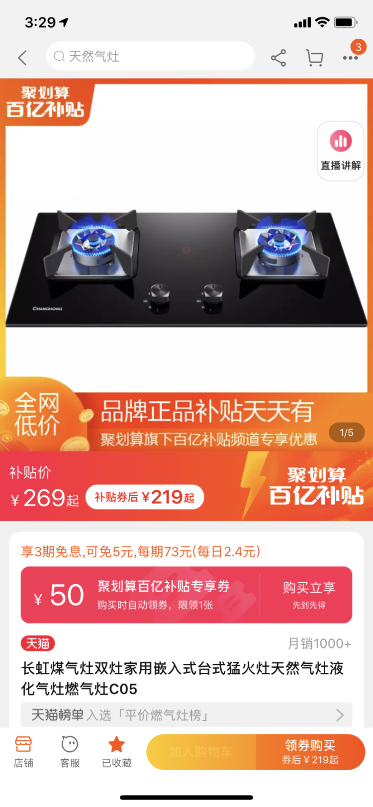 百亿补贴进入方法:先收藏加购宝贝,从手机端淘宝首页的百亿补贴入口进入,百亿补贴界面右上角搜索“长虹燃气灶”即可看到