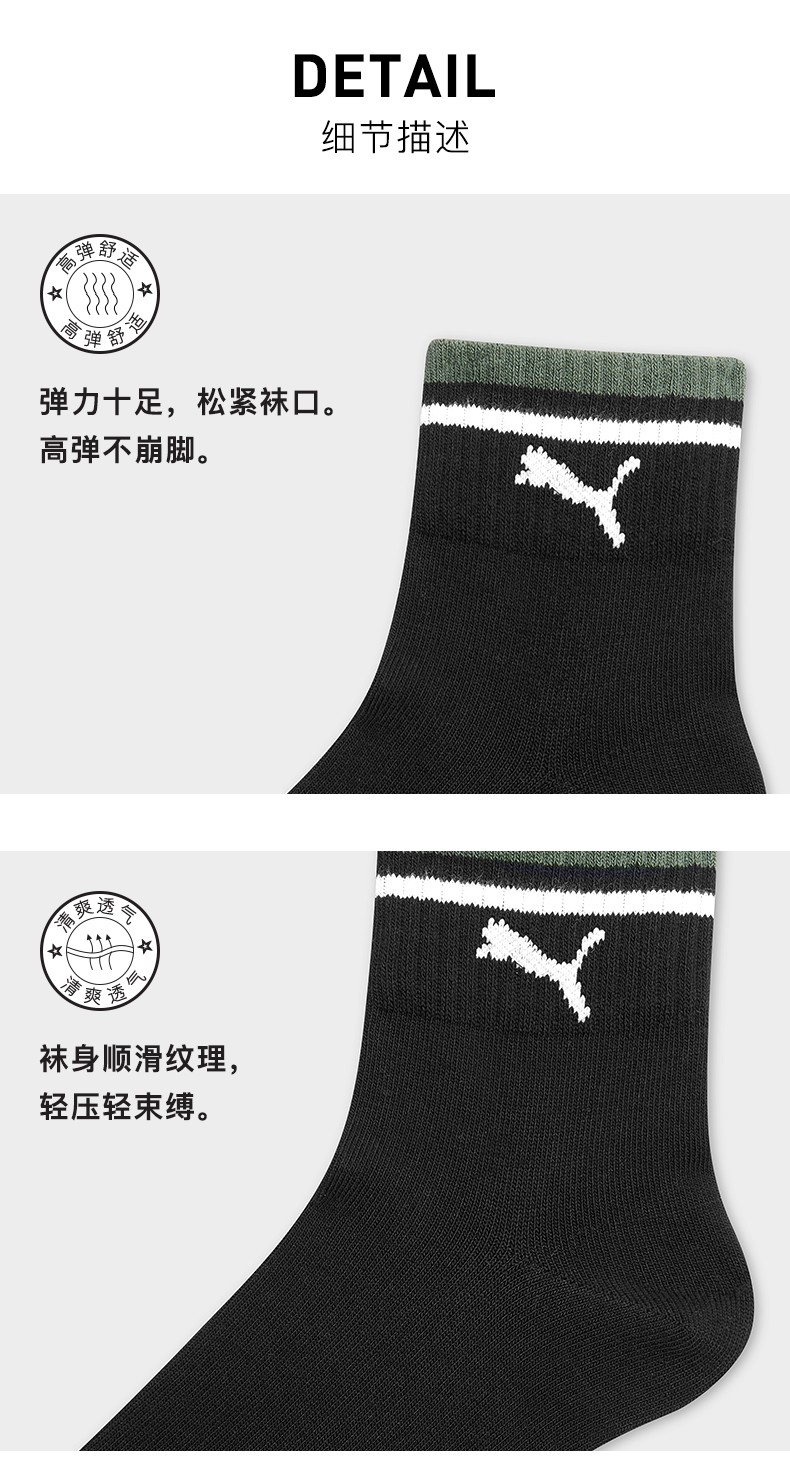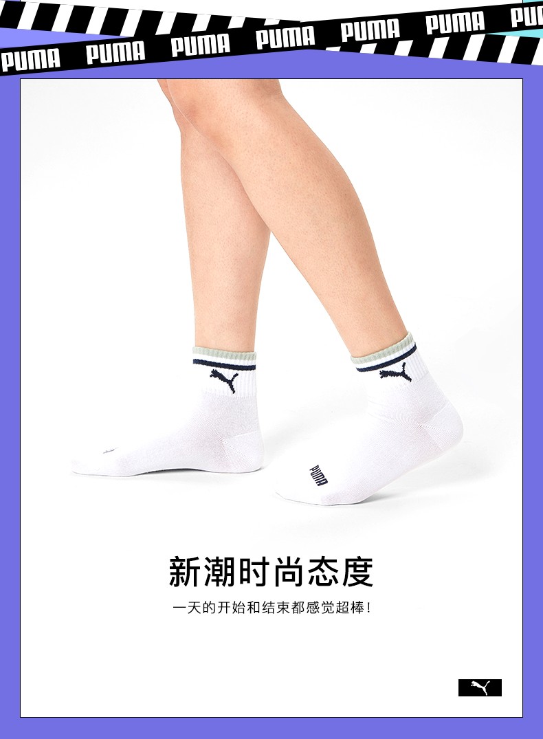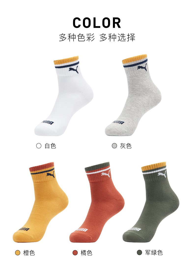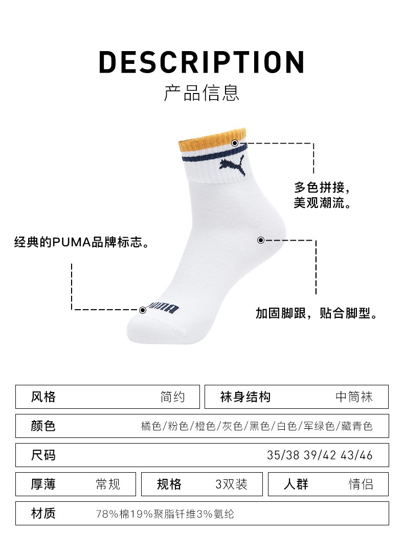 彪马(Puma)男女中筒棉袜,规格3双装,采用78%精梳棉,19%聚酯纤维和3%氨纶材质的纱线制成,精梳棉相对于一般的棉纱,更加的柔软光滑,面料表面平整,没有棉结,舒适亲肤,弹性好,透气性佳,袜口不紧绷,35-46码均有选择。