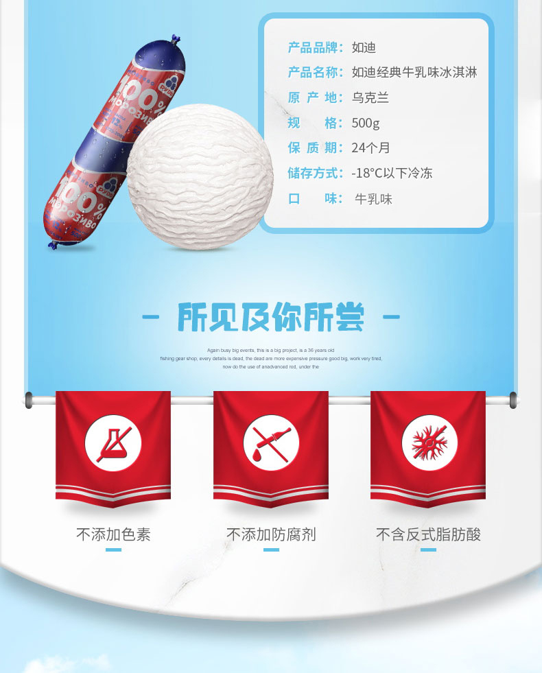 这款如迪 牛乳冰激凌,乌克兰原装进口,精选乌克兰喀尔巴阡山脉专属牧场鲜牛乳,奶源丝滑珍贵,乳脂含量12%(乳脂含量超10%才可称为牛乳),特地运用了巴氏奶冻工艺锁住营养,生牛乳含量达50%以上,在制作过程中无色素、无防腐剂、无反式脂肪酸,保证天然安全,口感香浓醇厚,甜而不腻。规格:500g*2盒。