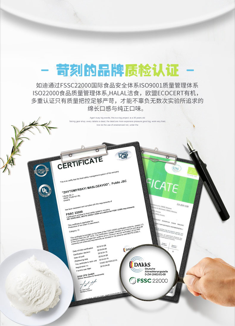 如迪是乌克兰国民品牌。通过乌克兰非转基因验证,FSSC22000国际食品安全体系、ISO9001管理体系、欧盟ECOCERT有机等多重认证,口味绵长纯正,已经出口全球20多个国家和地区,2017年首次进入中国市场。