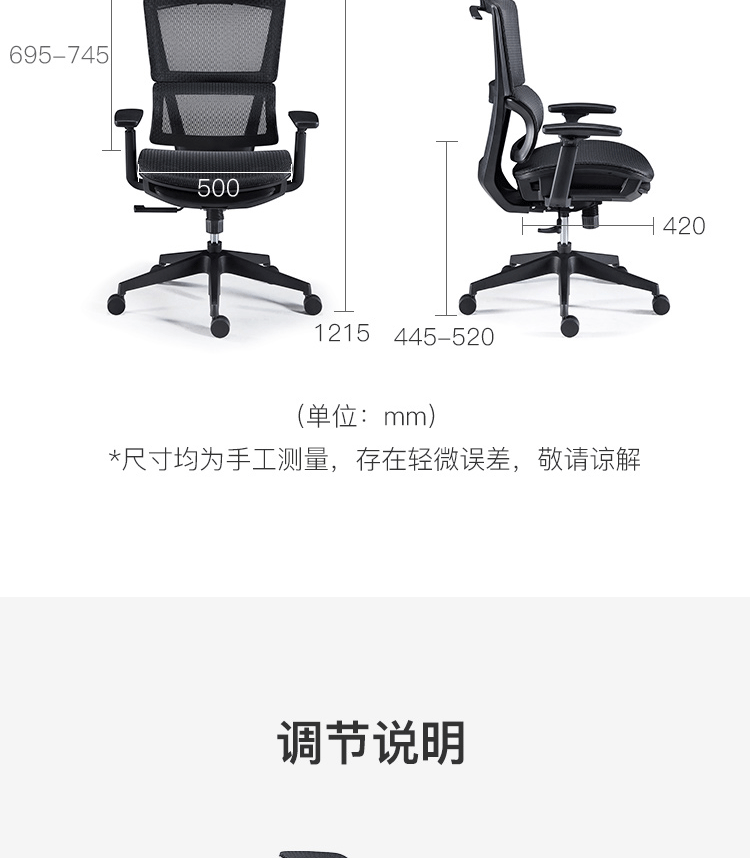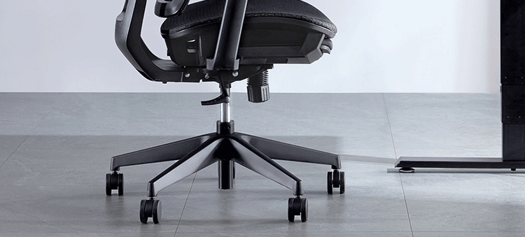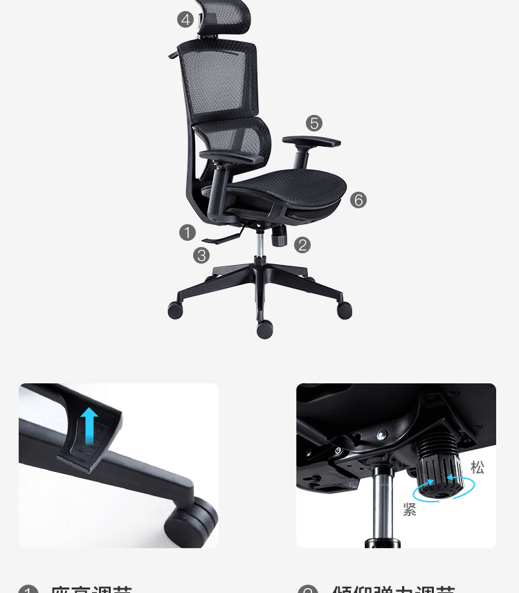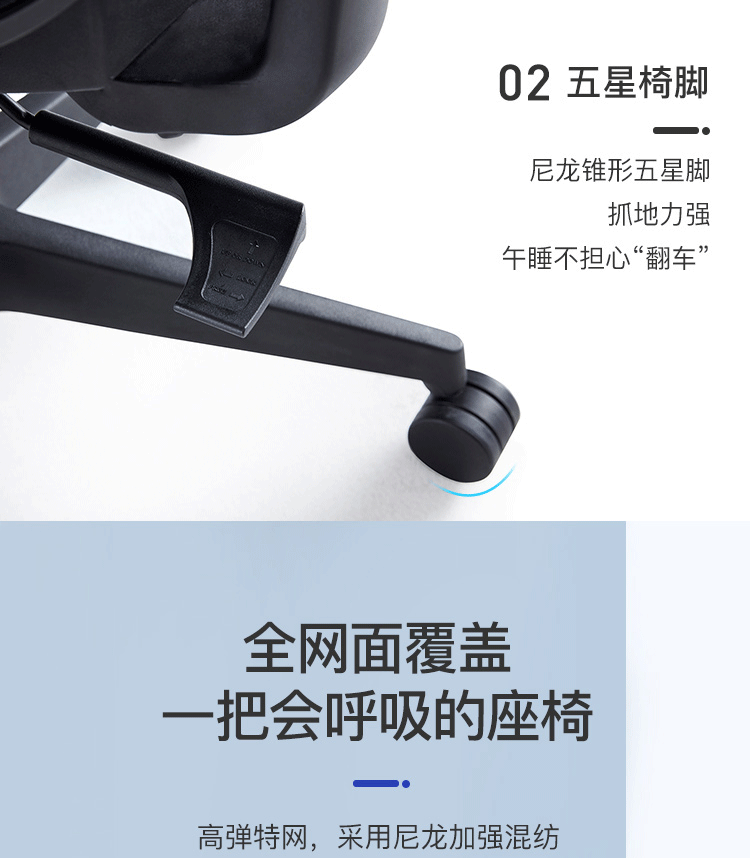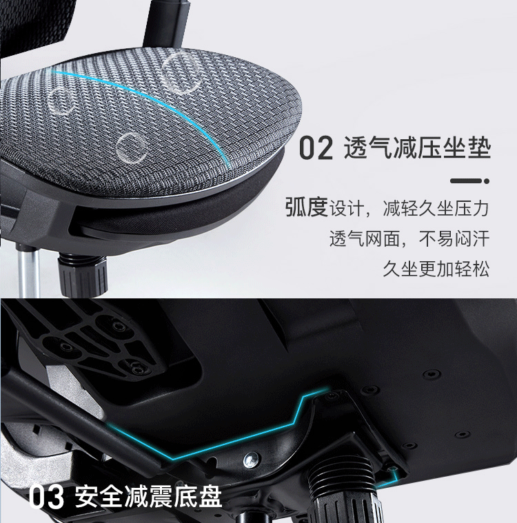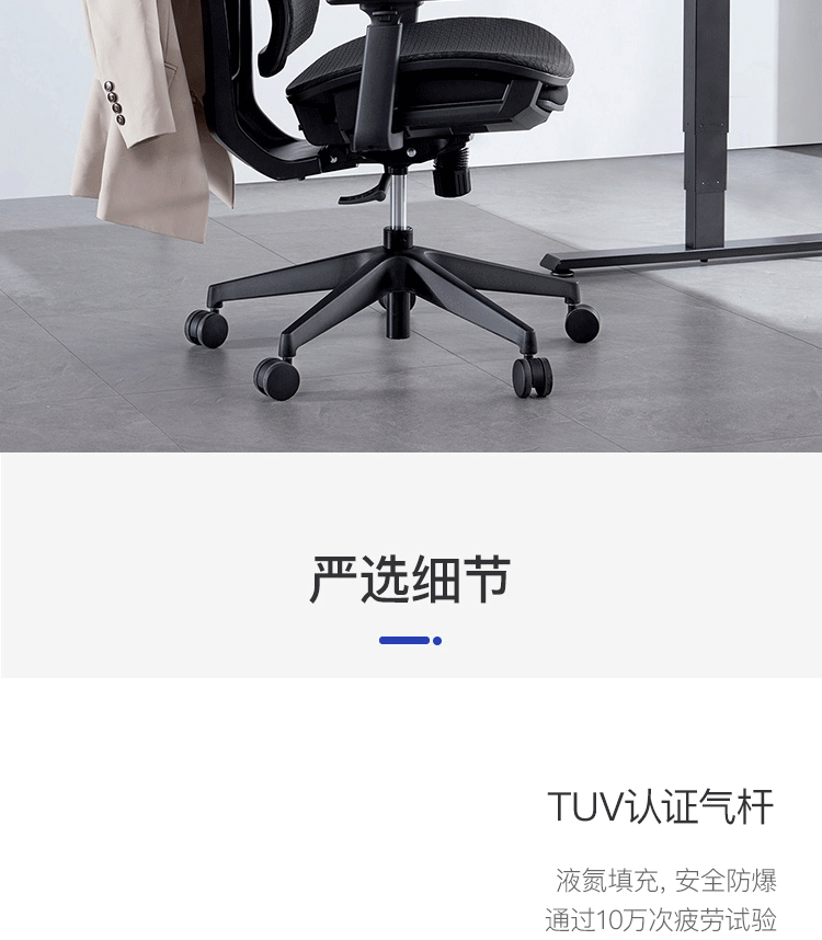 给颈部提供舒适支撑的高弹网布头枕,可调节高度,有效缓解颈椎压力。PU软垫扶手,释放手臂压力。 莱特气杆,防爆加厚底盘,在防爆和承重力上升级保护。底端采用静压承重五星脚,自由旋转万向轮,座椅静态承重在1136kg左右,可以适应各种身形的人使用。