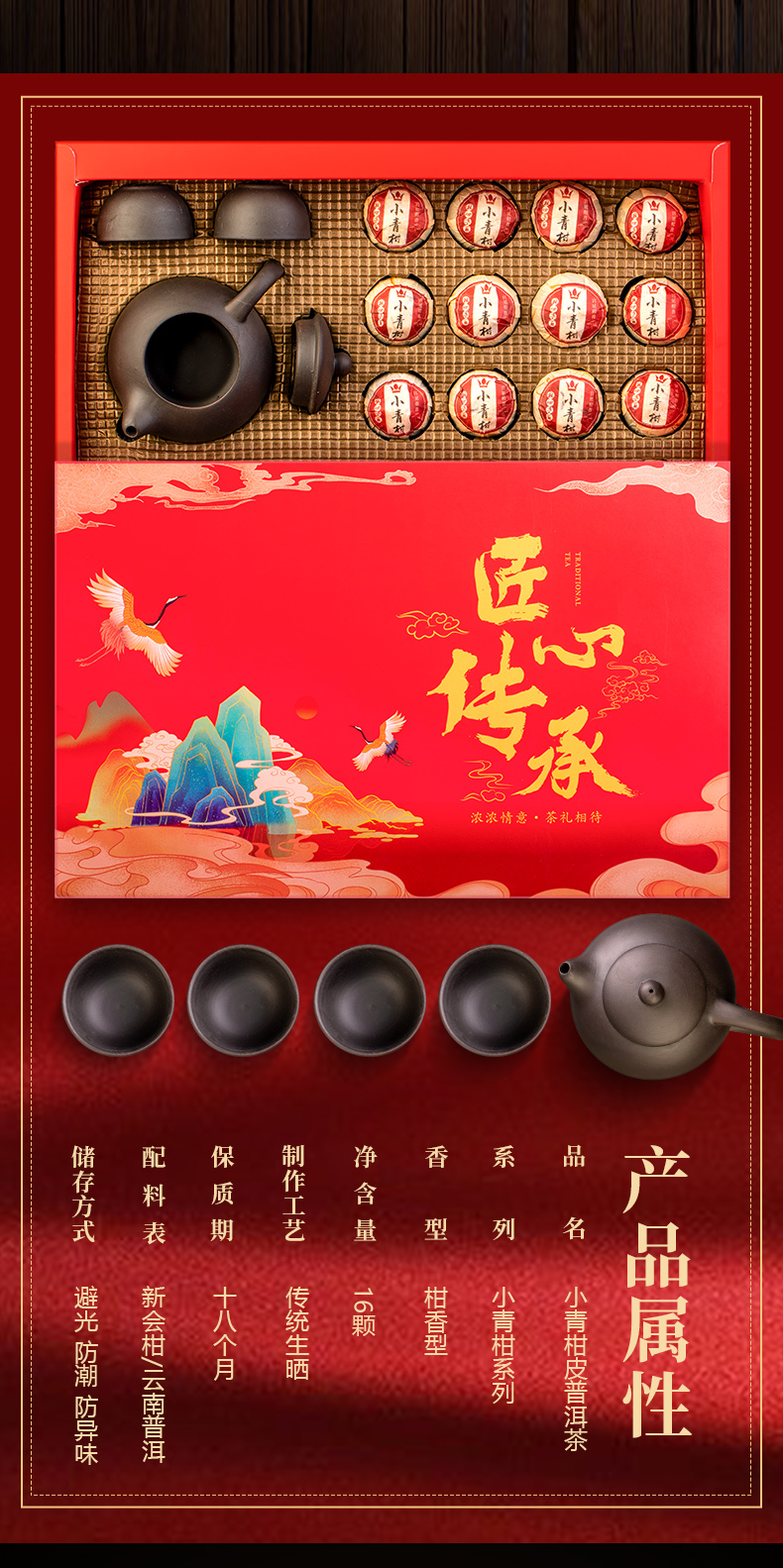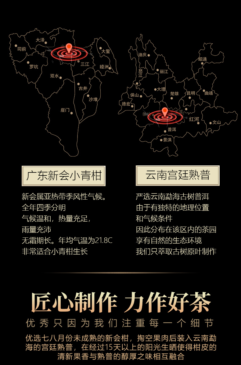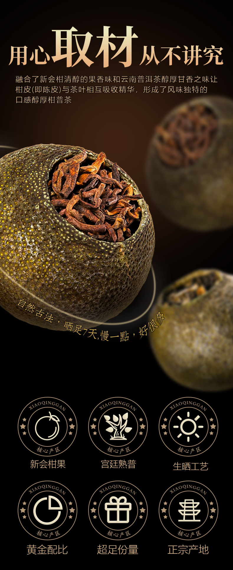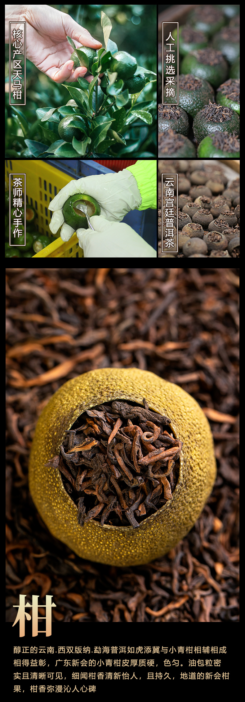 广东新会小青柑,内料萃取百年古树产的宫廷上等普洱。柑皮厚实,既有柑皮果香,也有普洱醇香,入口清甜甘润,回甘上乘,一颗可泡一整天,具有排毒养颜,去油解腻,护肝护胃等功效。