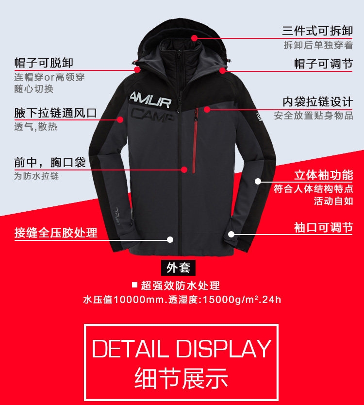 Amurcamp这款三合一棉服,外层10000mm水压、15000mm透湿的防水冲锋衣,防水拉链,接缝全压胶防水处理,防水效果优秀,超出大多数冲锋衣的5000-8000mm水压。里层是棉服内胆,填充120克仿丝棉,保暖效果优于抓绒。