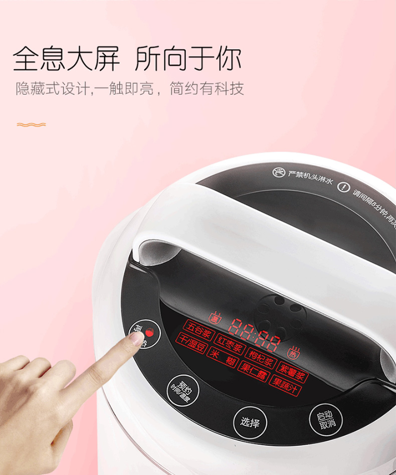 双层保温防烫机身设计,内层是304食品级不锈钢,外层是彩钢覆膜,能防烫手、降噪音和保温。顶部是全息触屏操作界面,有再加热、预约(时间/温度)、功能选择(五谷浆、红枣浆、枸杞浆、紫薯浆、干/湿豆、米糊、果仁露、果蔬汁)、启动/取消,快速浆这些快捷键。