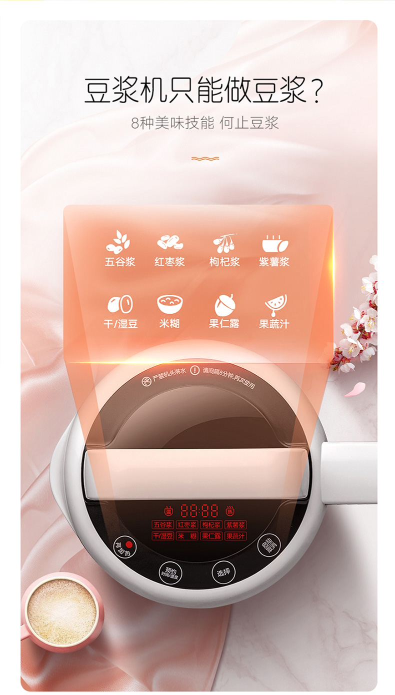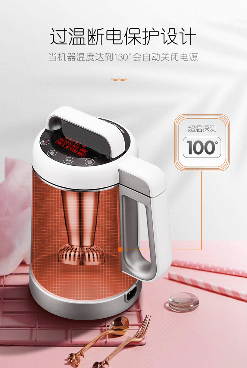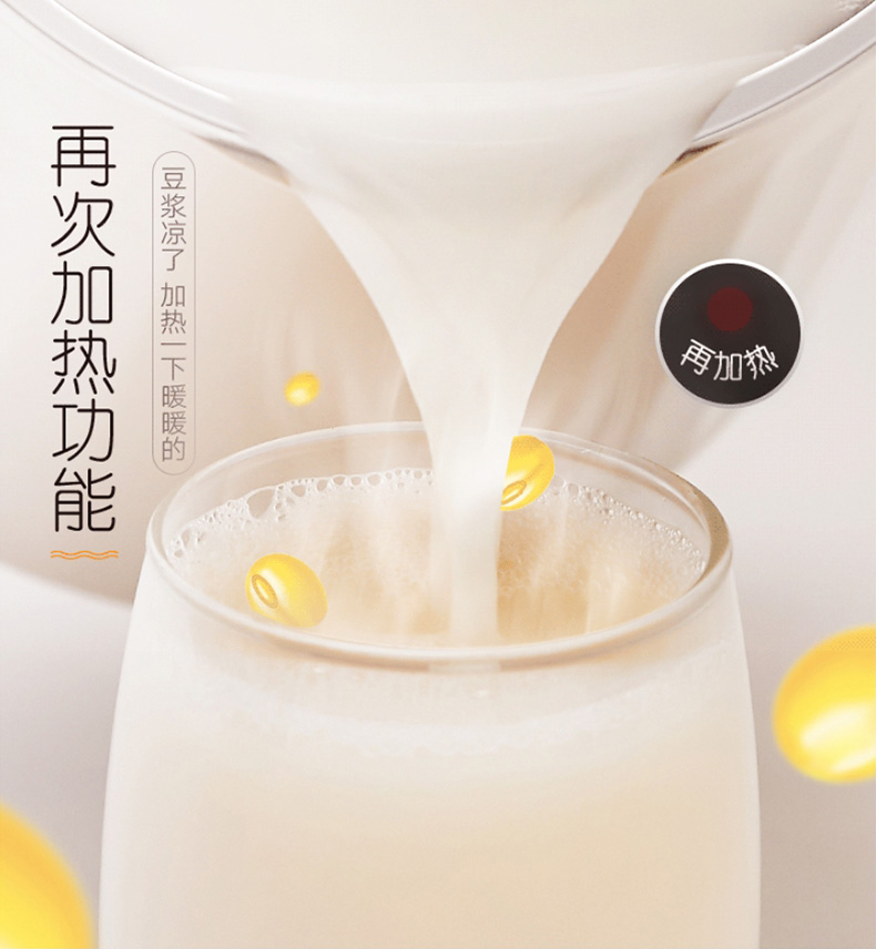 拥有智能熬煮程序,针对不同食材,采用不同的研磨时间、力度、熬煮时间、温度等,都有非常科学的规范,达到充分释放不同食材的营养;底侧立体加热,豆浆在制作过程中不糊底。
