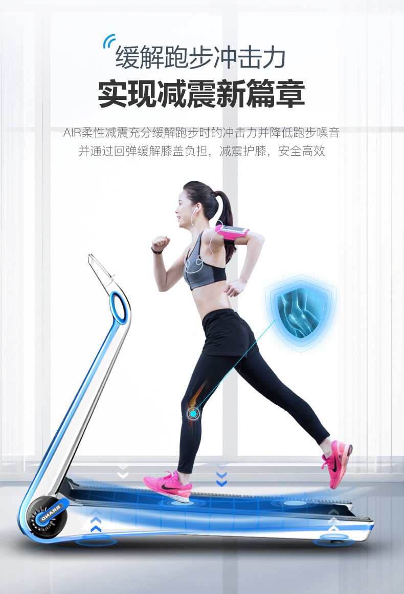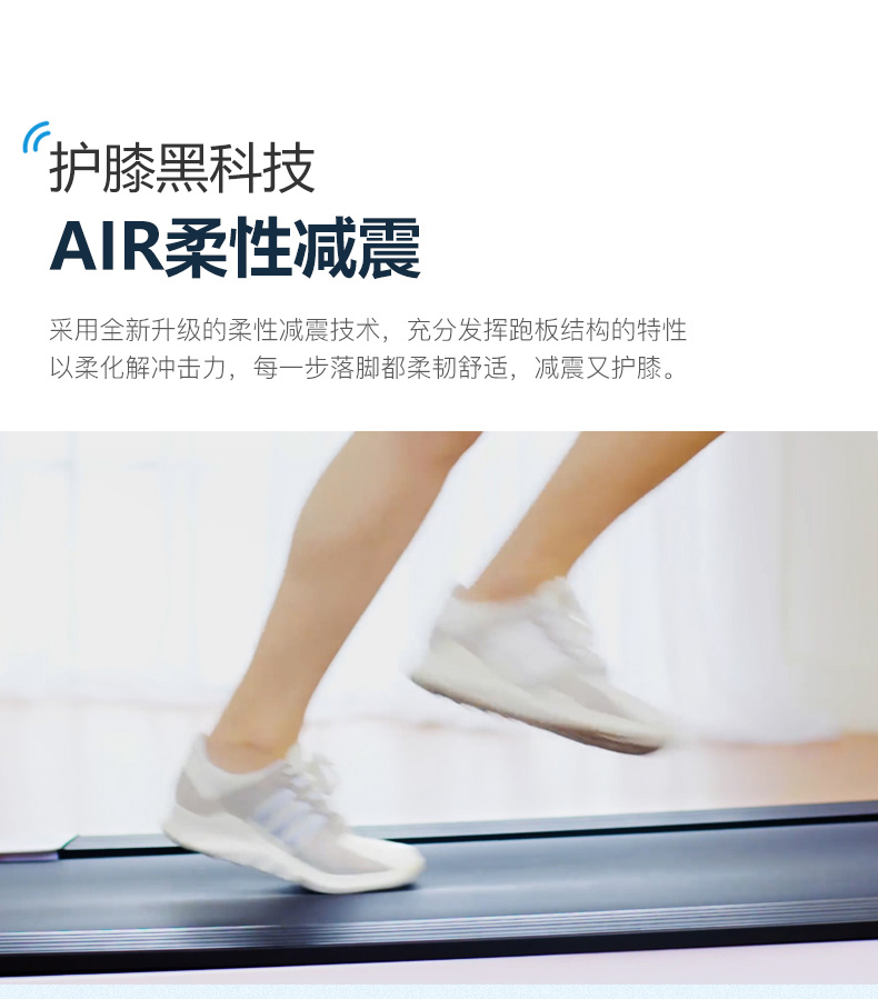 采用全新升级的AIR柔性减震技术,充分发挥跑板结构的特性,以柔化解跑步时的冲击力,每一步落脚都柔韧舒适,通过回弹缓解膝盖负担,减震护膝,安全高效,并降低跑步噪音。