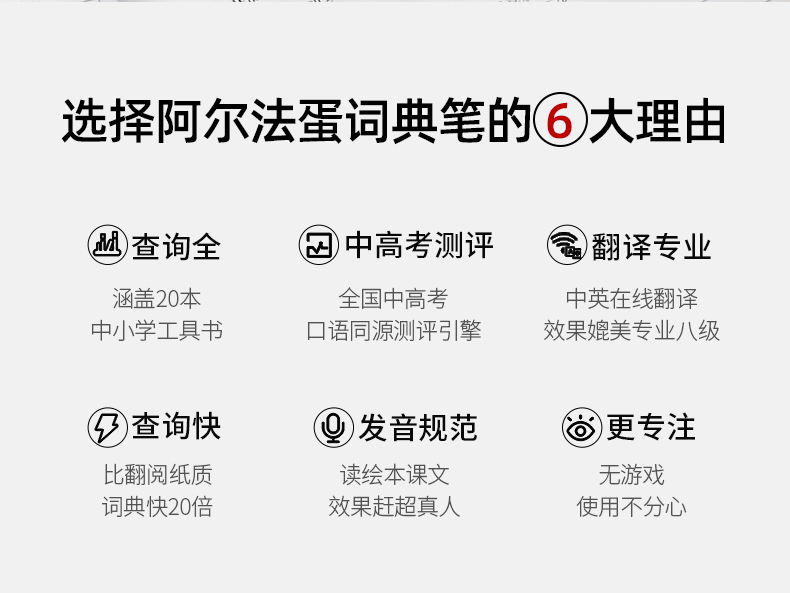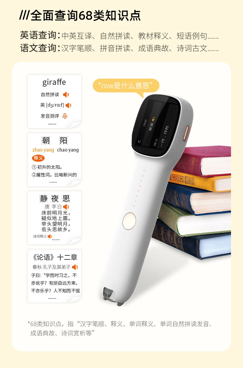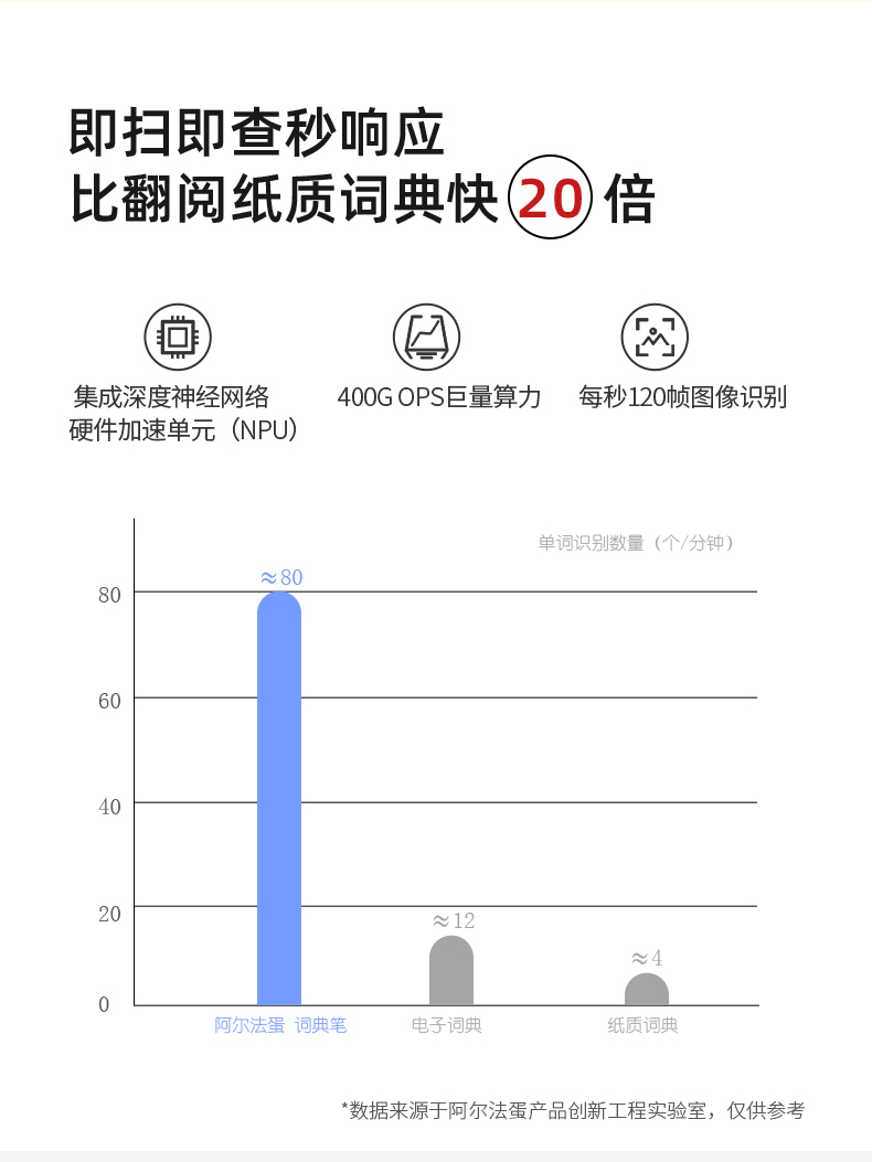 这款阿尔法蛋的词典笔是专为迅速学习设计,涵盖英语专业八级以下的所有词汇,使用科大讯飞的翻译技术,极速翻译不出错,语音对标全国中高考口语,发音规范,效果赶超真人,深度神经网络加速单元,搭配120帧/秒的图像识别,一扫即查,比纸质字典快20倍,而且无游戏功能,学习更能集中精神。