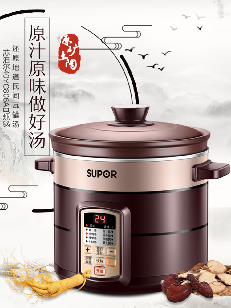 家用电炖锅,4L大容量,一次可煮12碗大分量,文火慢炖,可24H定时预约,原矿土陶内胆,富含微量元素,环绕式立体加热,释放食材深层营养,细煮慢炖,越熬越香,多功能菜单,全程免看管。