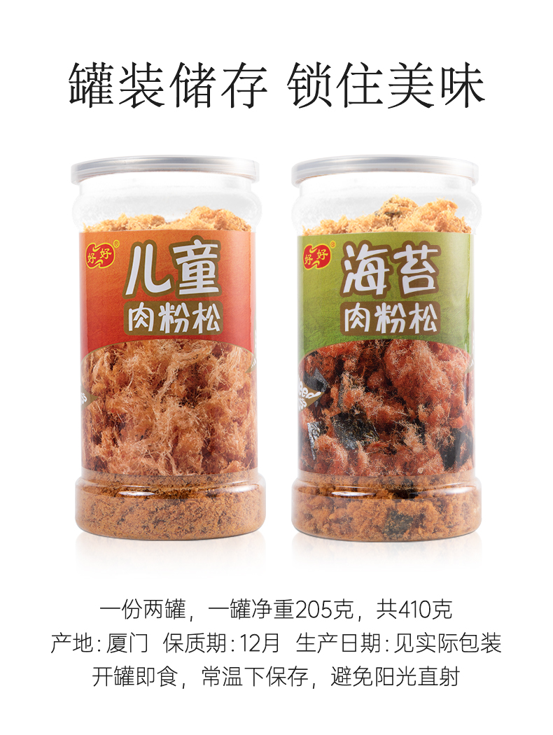 天猫鑫康能食品专营店39.9元,可领10元优惠券,实付29.9元到手,有原味和海苔味可选。规格为205g*2罐。