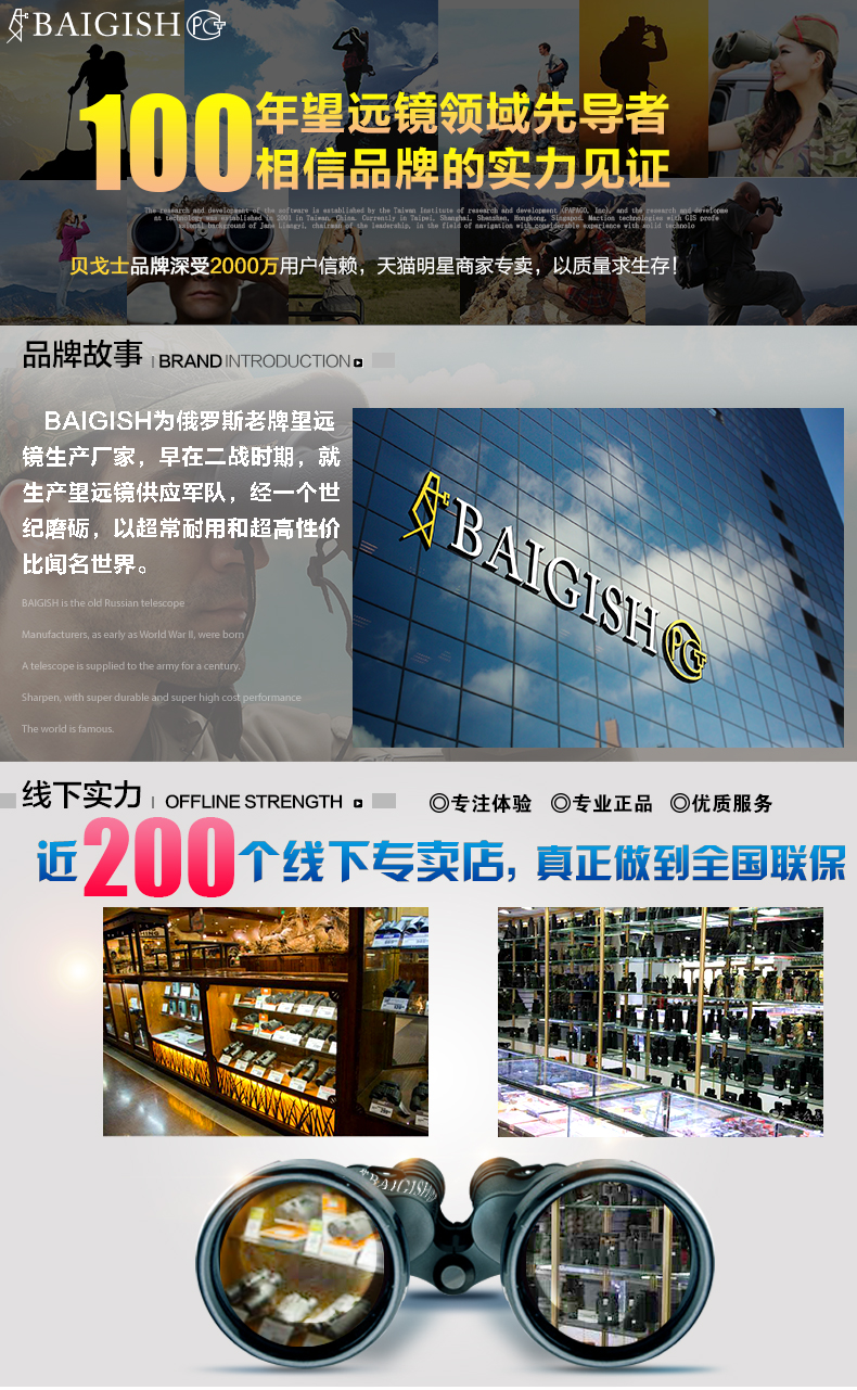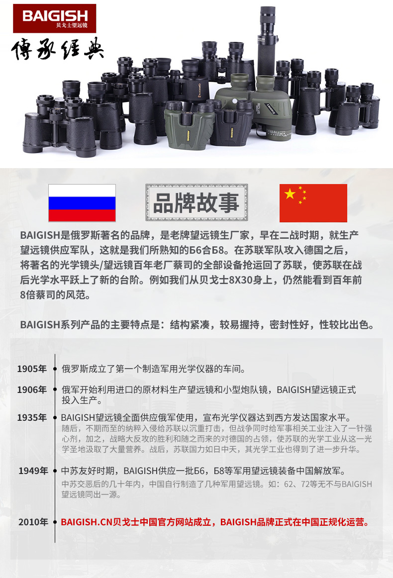 BAIGISH(贝戈士)为俄罗斯老牌望远镜生产厂家,早在二战时期,就生产望远镜供应军队,经过一个世纪的磨砺,以超常耐用和超高性价比闻名世界。品牌专注于望远镜的研发、生产。产品涵盖各类型双筒望远镜、观鸟镜、手机望远镜等。销售网络遍及中国、中东、欧美等全球100多个国家和地区,深受广大户外运动、特殊工种以及家庭消费者的青睐。