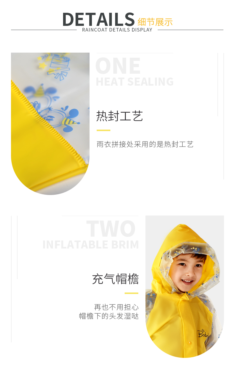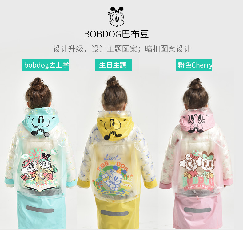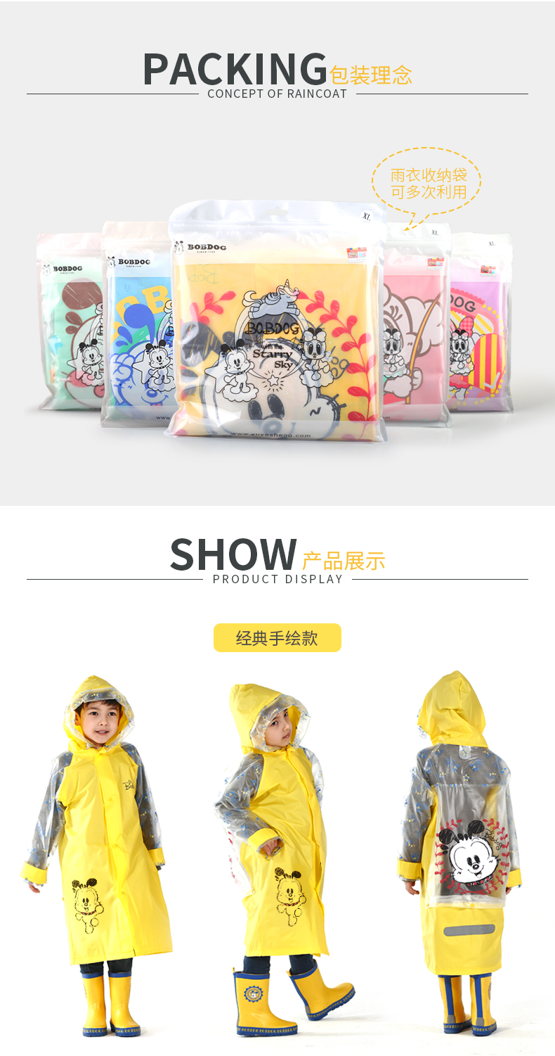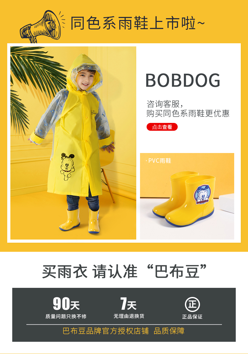 天猫bobdog巴布豆网渠专卖店49元,可领20元优惠券,实付29元到手,巴布豆儿童雨衣使用PVC (6P) 材料,加厚抗污,无异味,经过了专业的检测认证,彩色包边拼接处采用热封工艺,充气帽檐不担心水滴流下弄湿头发,带有隐藏书包位,暗扣设计,收纳书包更方便,后背带反光条,增加出行安全,适合身高90-150cm儿童、