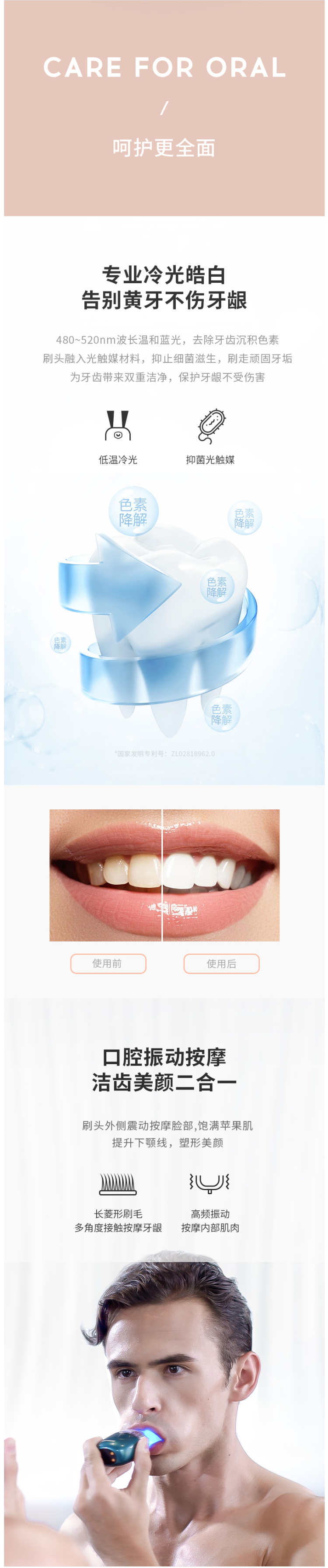 专业冷光皓白功能,能告别黄牙同时不伤牙龈。480~520nm波长温和蓝光,去除牙齿沉积色素。刷头融入光触媒材料,抑止细菌滋生,刷走顽固牙垢为牙齿带来双重洁净,保护牙龈不受伤害。