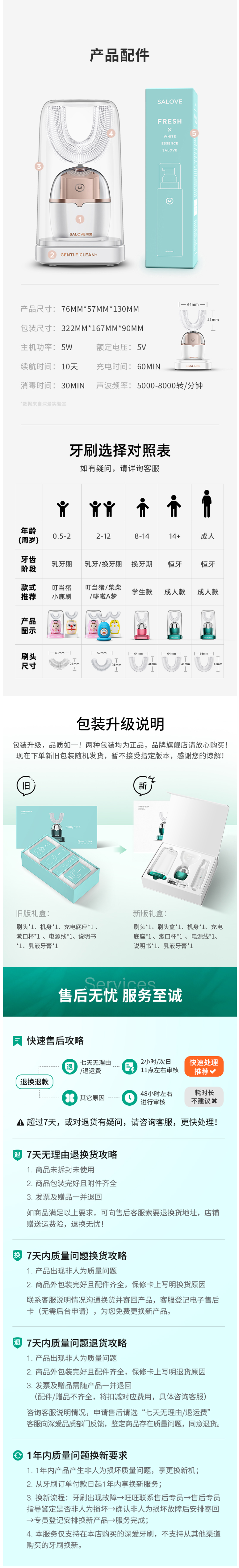 这款深爱 充电式全自动U型电动牙刷,创新U型结构设计,全面贴合牙齿,从里到外深入齿间,洁净牙齿,拥有美国FCC认证、欧盟RoHS认证、美国FDA认证、韩国KCC认证,安全可靠。