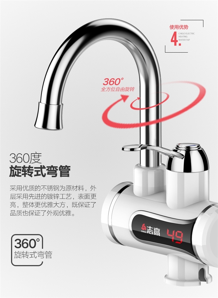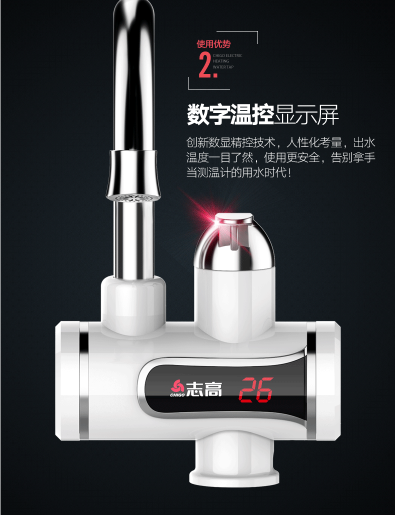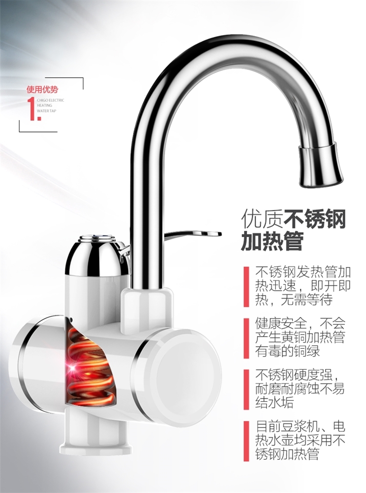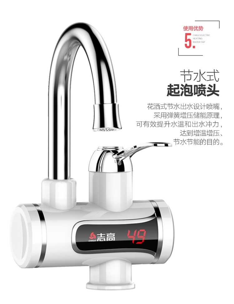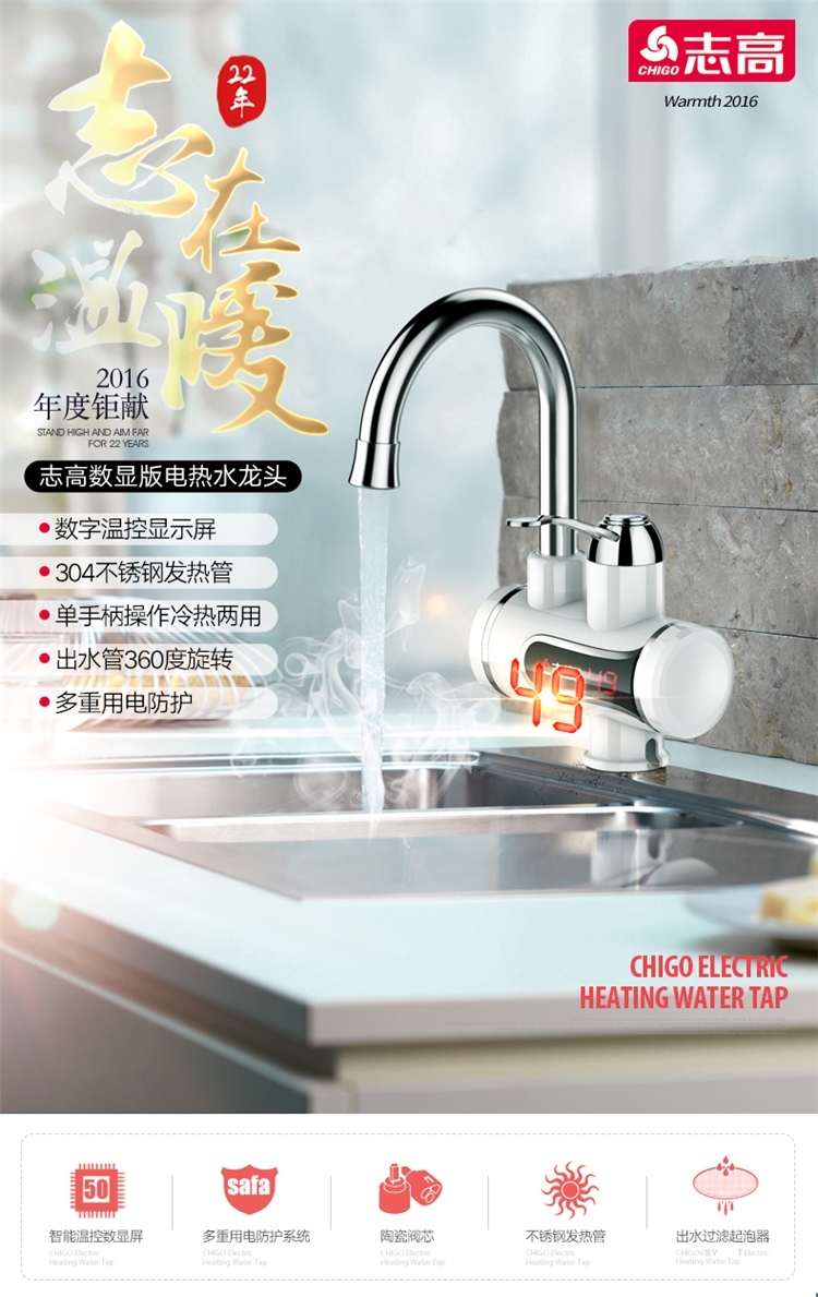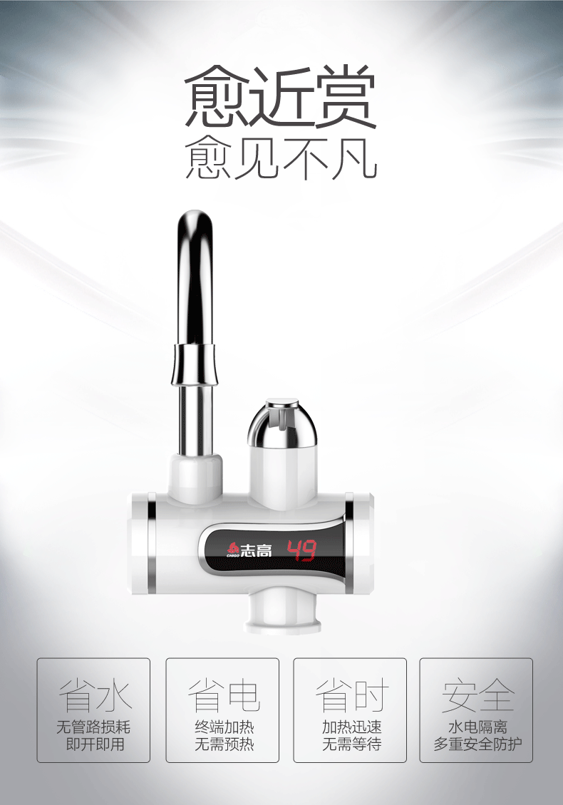 志高的这款,3S即出热水,主体三层电镀工艺,抗刮能力出众;加热管不锈钢材质,经过酸洗和电镀,不易产生锈蚀;冷热两用,双手柄开关,机身设置屏幕,实时显示当前的出水温度。