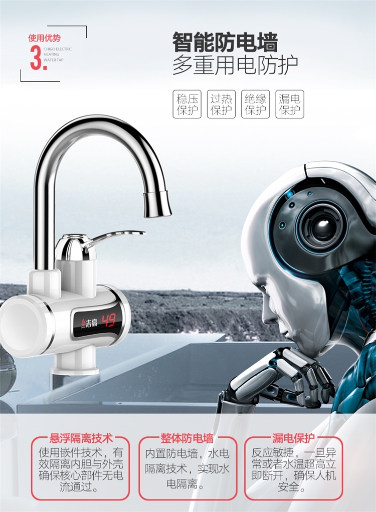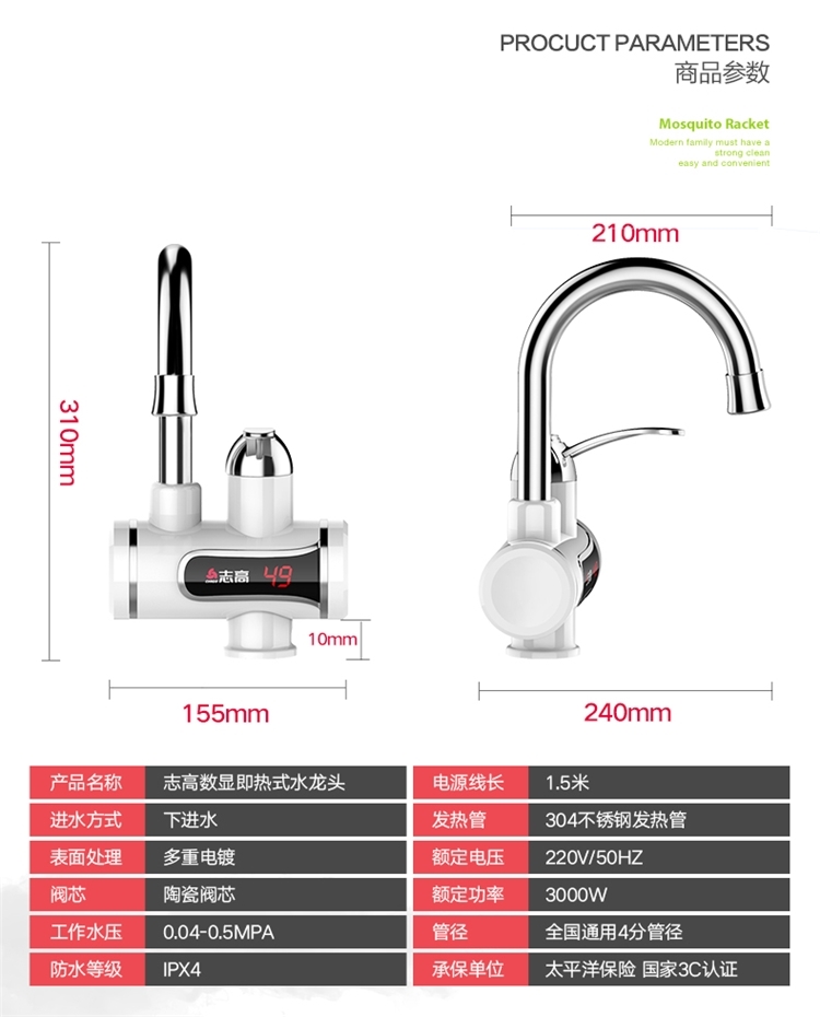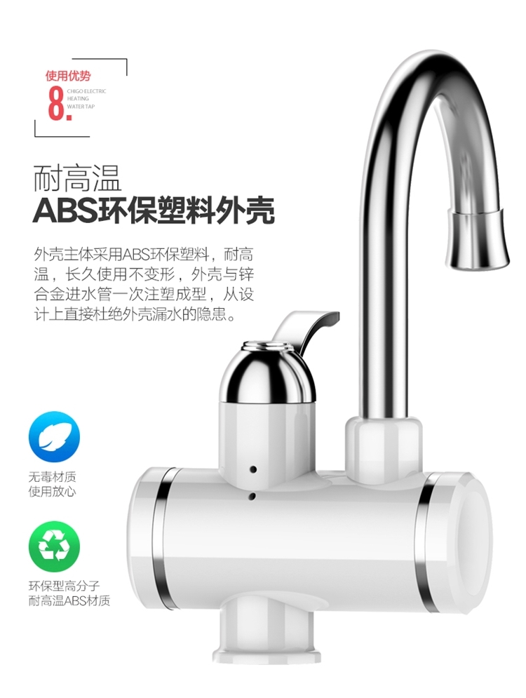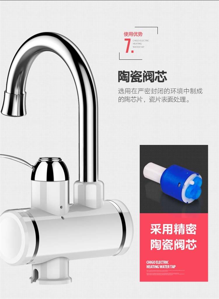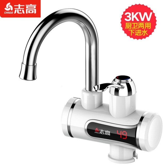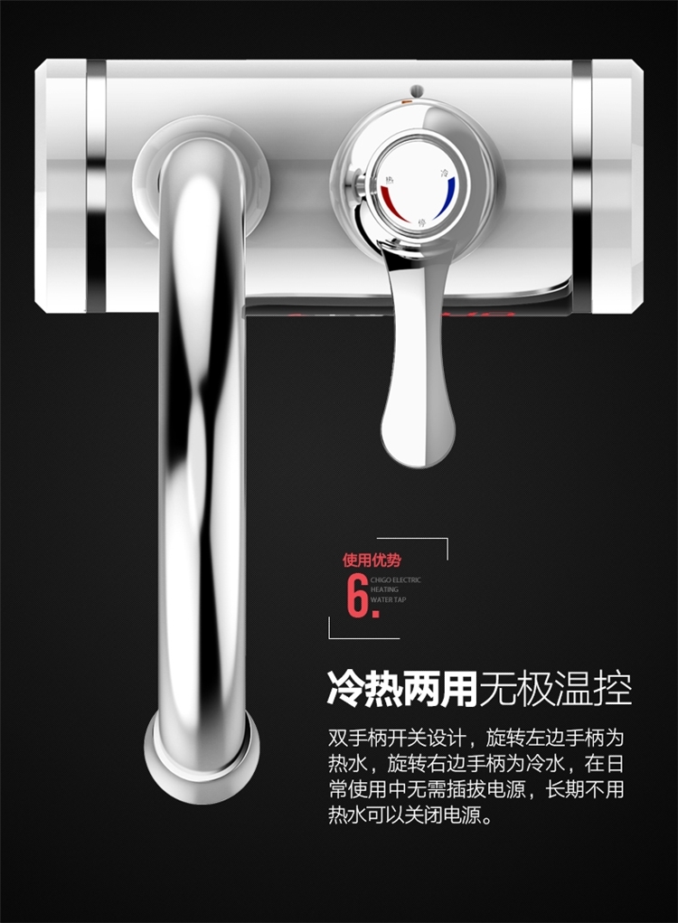 志高的这款,3S即出热水,主体三层电镀工艺,抗刮能力出众;加热管不锈钢材质,经过酸洗和电镀,不易产生锈蚀;冷热两用,双手柄开关,机身设置屏幕,实时显示当前的出水温度。