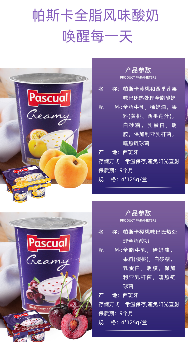 帕斯卡PASCUAL 全脂浓稠酸奶,西班牙原装进口,采用欧盟高品质的醇正牛奶,保加利亚乳杆菌发酵制成,口感浓稠柔滑,奶香醇厚,酸奶含量82%以上,另外还含有丰富的水果果粒,经过巴氏杀菌处理,保证了酸奶内的营养成分不流失,吃的放心。