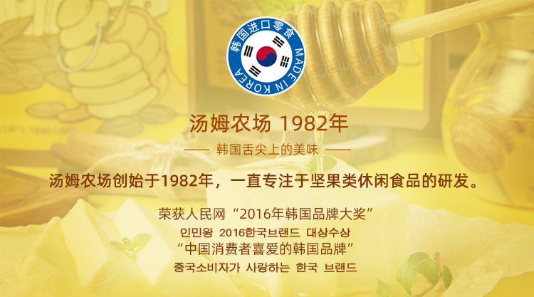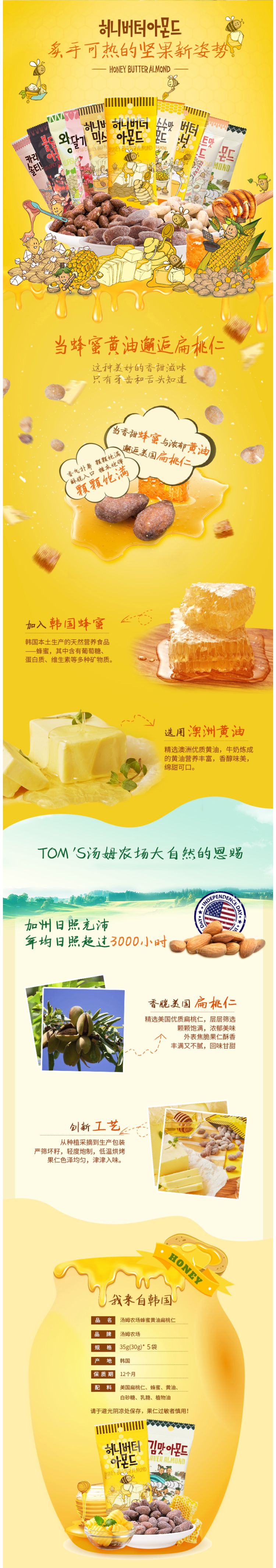 这款汤姆农场 蜂蜜黄油扁桃仁,韩国原装进口,精选果实饱满香酥脆爽的美国加州扁桃仁,再搭配韩国本土蜂蜜、澳洲产奶酪及白砂糖、糖稀、牛奶等成分制成,口感清脆酥香。
