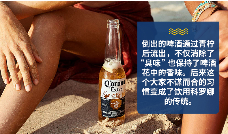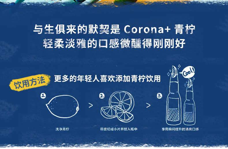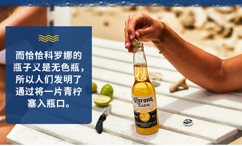 墨西哥人把柠檬随手放入科罗娜中,偶然发现柠檬的酸甜与清凉的科罗娜竟是绝配,此特殊喝法于是在美墨边境流传开来,并成为独一无二的「科罗娜加柠檬」,酸甜的柠檬与清凉的科罗娜啤酒堪称举世无双的绝妙搭配。