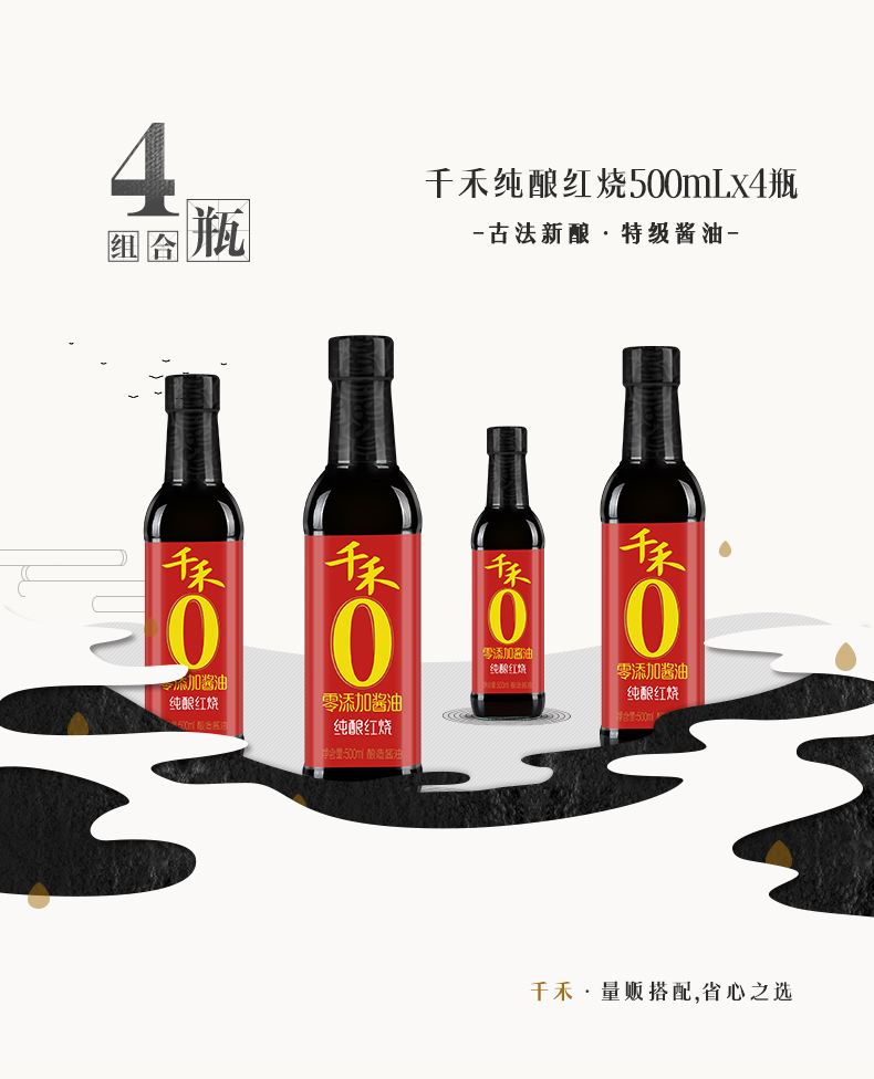 这款千禾 纯酿红烧老抽酱油,规格:500ml*4瓶 ,非转基因原料,原味原香,零添加,不汲取、不压榨、只选取自然浸出的头道原油,采用高盐稀态工艺,实现每百毫升的氨基酸≥1.0g,高于特级标准。无论焖烧炖煮,烧菜红亮不发黑,咸甜适宜。
