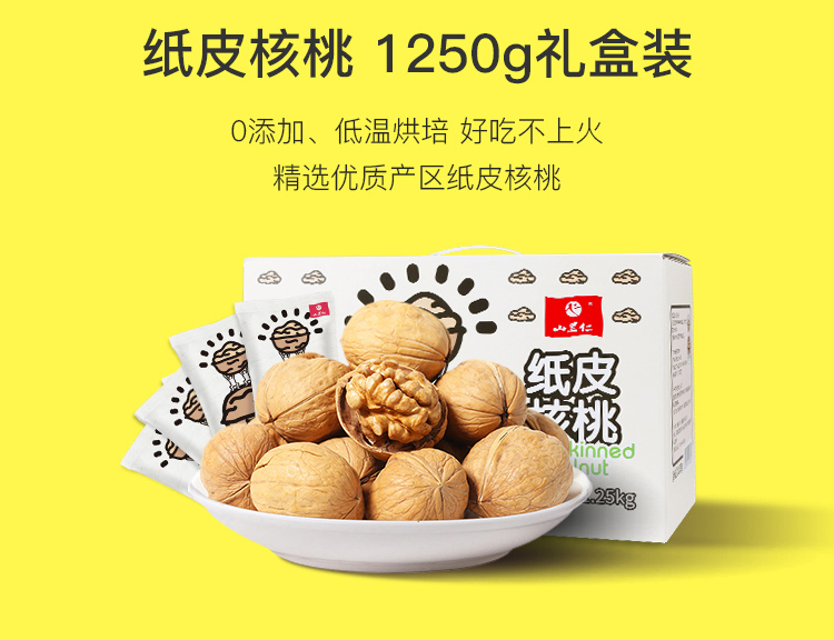 这款山里仁 有机认证薄皮熟核桃,规格:1250g礼盒装 ,精选新疆阿克苏纸皮核桃,0添加,低温烘焙,营养不流失,口感酥脆醇香,好吃不上火;个大壳薄,颗颗饱满,出仁高,味道清香;约30小袋独立包装,更干净卫生,食用方便。