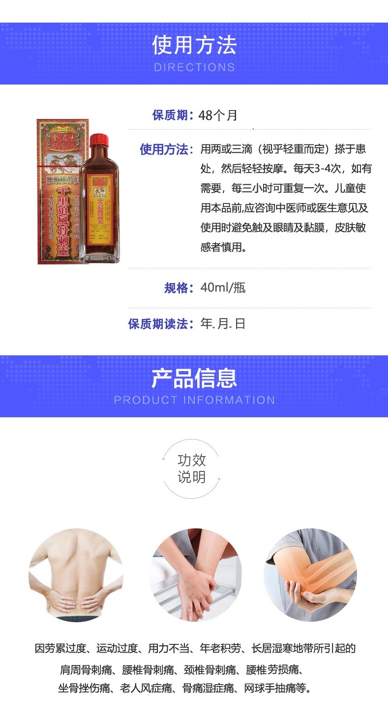 这款金波士 千里追风骨刺灵活络油,香港原装进口,可用于因劳累过度、运动过度、用力不当、年老积劳、长居湿寒地带所引起的肩周骨刺痛、腰椎骨刺痛、颈椎骨刺痛、腰椎劳损痛、坐骨挫伤痛、老人风症痛、骨痛湿症痛、网球手抽痛等。