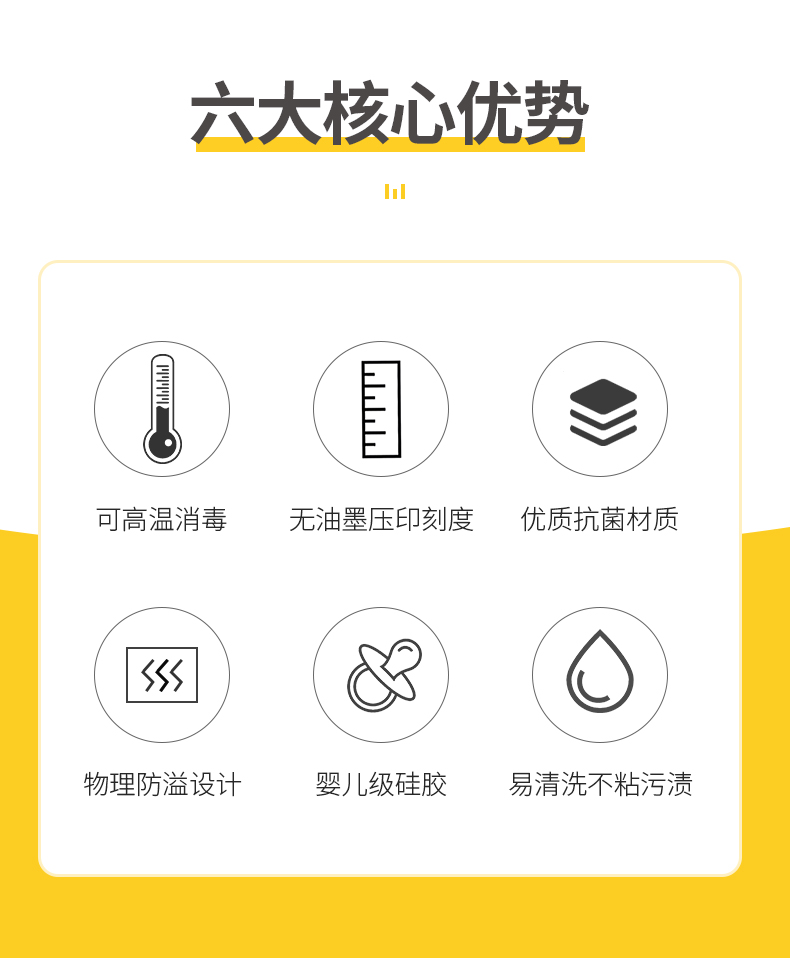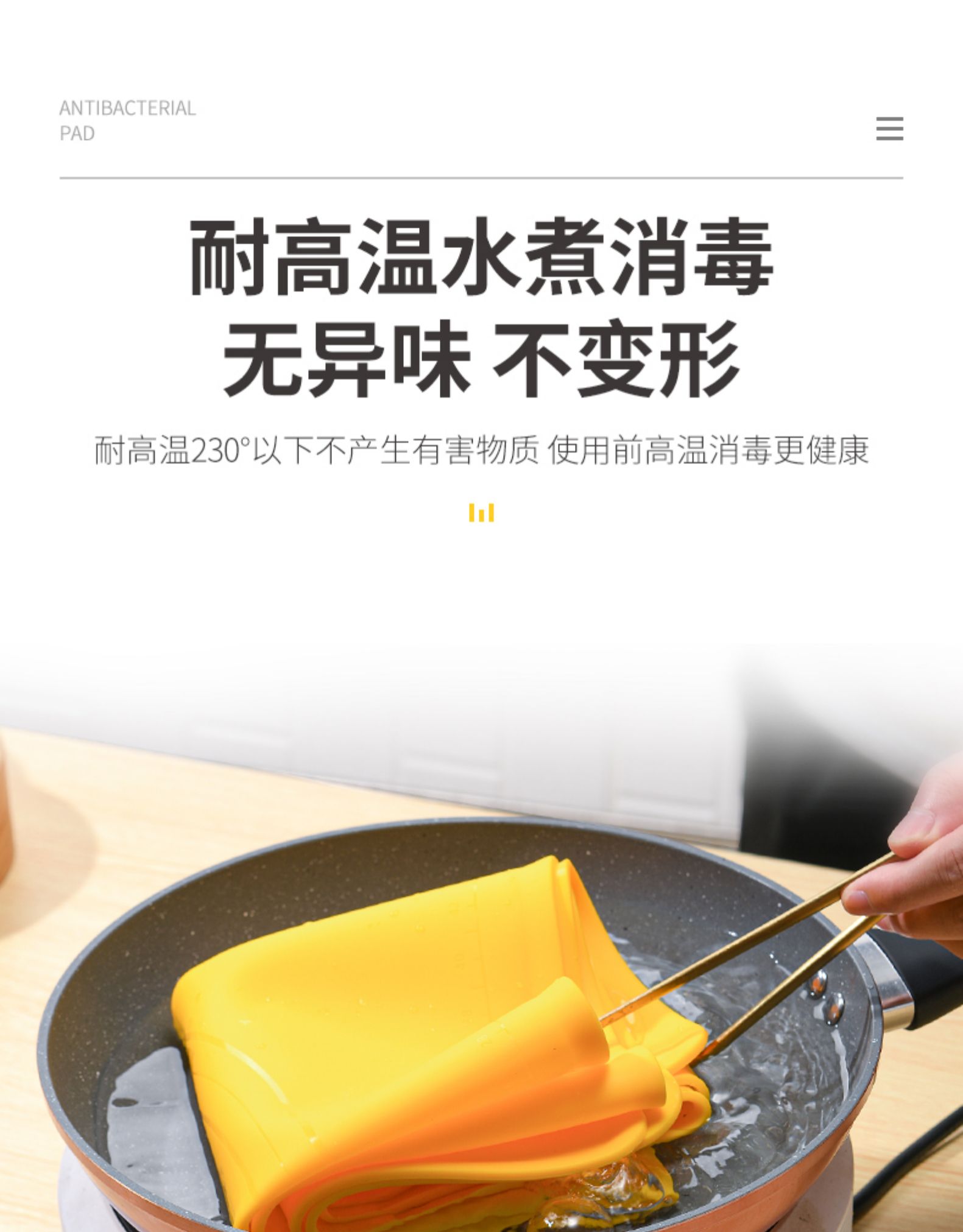 精选德国瓦克硅胶为原料,通过欧盟认证,婴儿级标准+银离子抗菌工艺,无毒无异味,耐高温-40℃-230℃,长时间使用后可开水煮开消毒。表面不沾油、不沾面,一冲即净,可卷可折,轻松收纳不占空间。