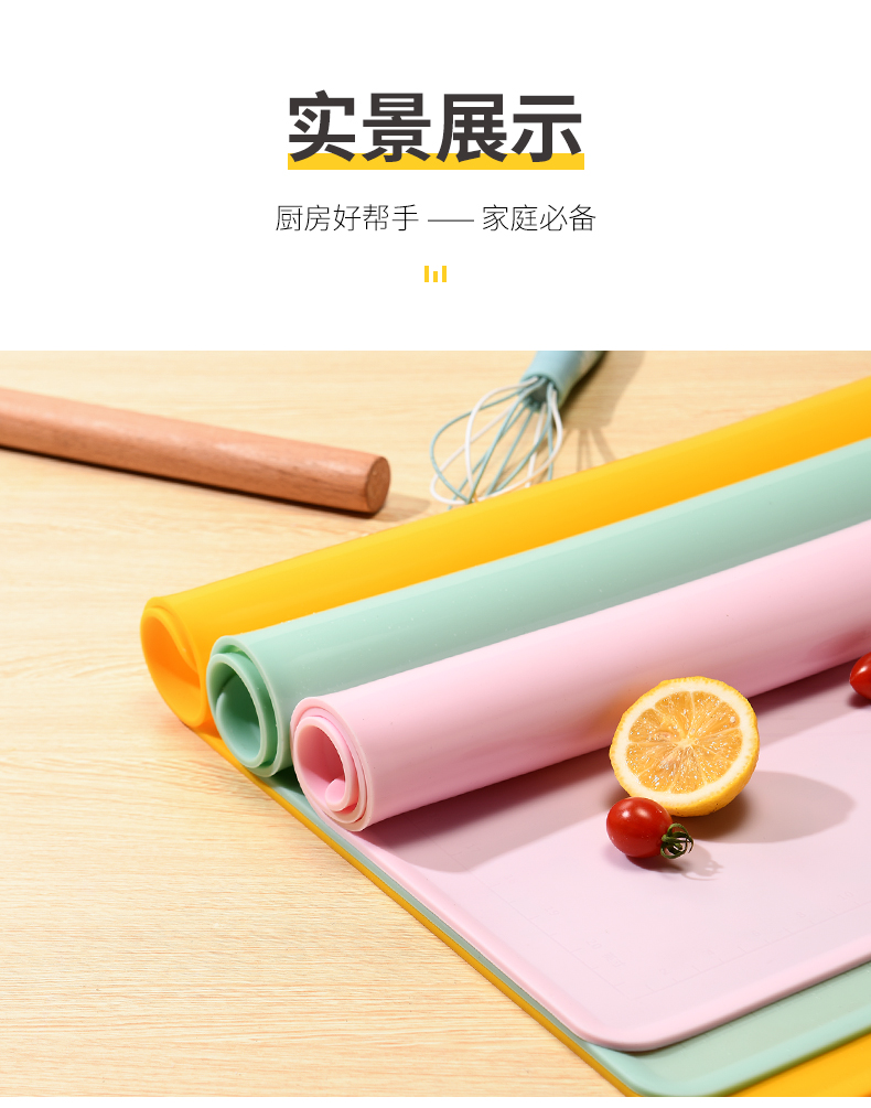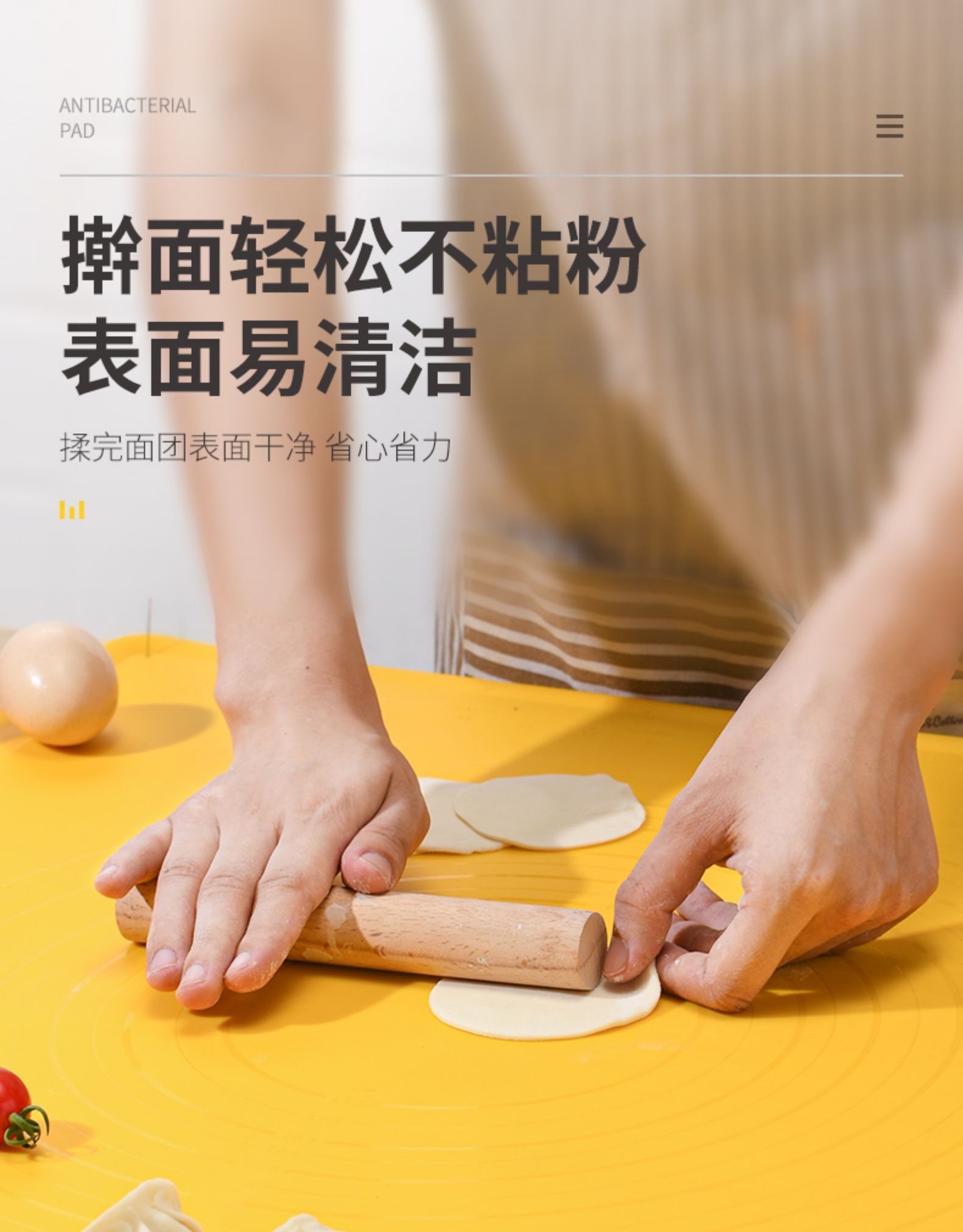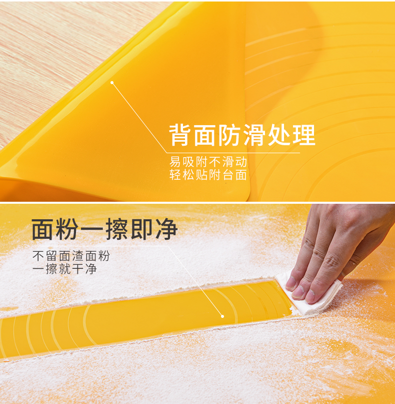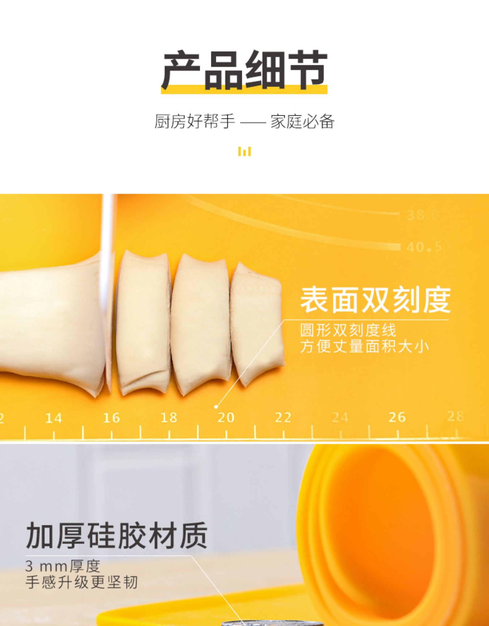 升级防溢设计,周边加厚和面防止水流溢出,背面防滑吸附桌面稳定,坚韧耐用不易翘边。揉面垫带有雕刻式刻度,相比油墨印染不掉色、不侵染食物,方便掌握用量,烘焙、包饺子,制作面点随心所欲,让你拥有更大的施展空间,喜欢制作面点的朋友不容错过。(注:硅胶材质不易使用锋利刀具)