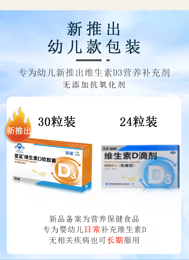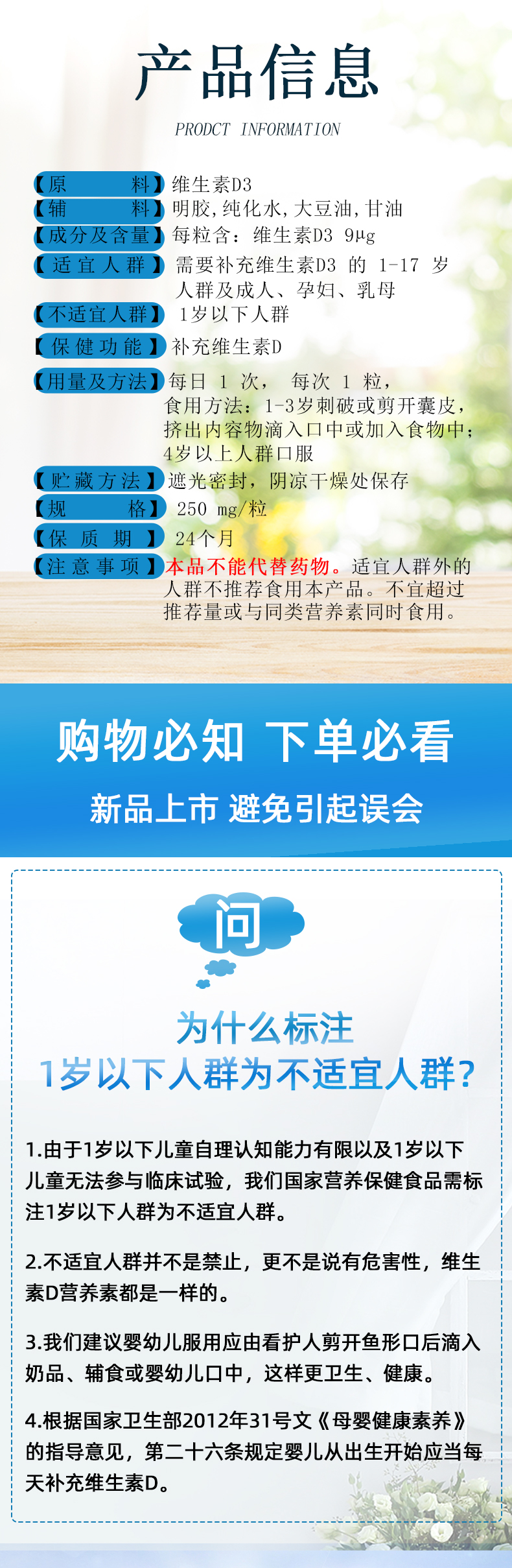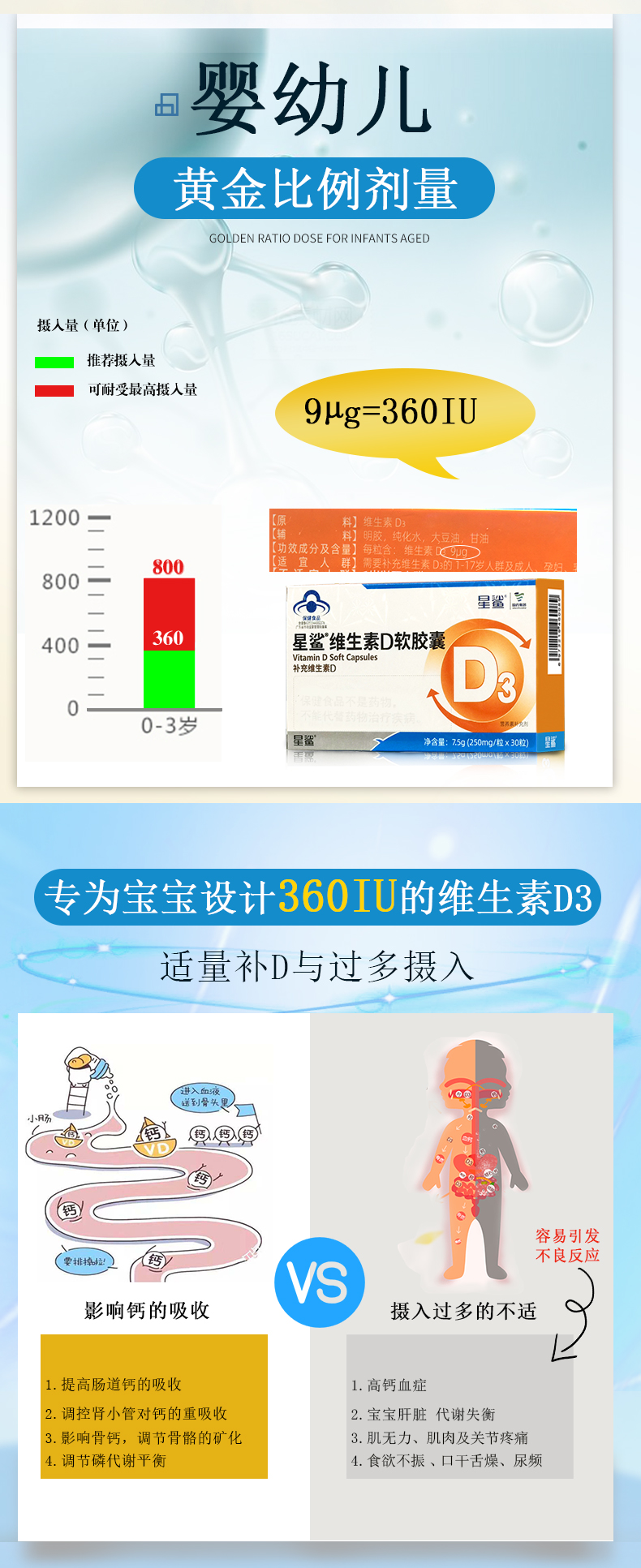 新升级30粒装,线下药房24粒款要40多一盒,专为宝宝设计360IU的维生素D3,无添加抗氧化剂,提高钙吸收,调节磷代谢平衡,助力宝宝健康成长,胶囊型密封遮光、隔绝空气,保障产品活性稳定,一天一粒容易控制分量,可直接吞服,也可滴在辅食或果汁中服用,对于婴幼儿来说更易入口。