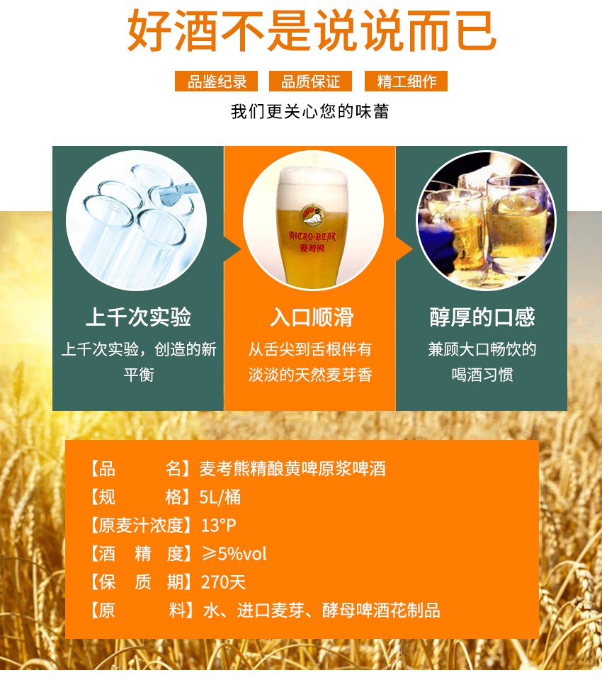 酒液浑浊粘稠,泡沫丰富,细腻如牛奶,绵绵持久,不添加CO2,喝了不涨肚。原麦汁浓度 13°P、酒精度≥5%VOL。