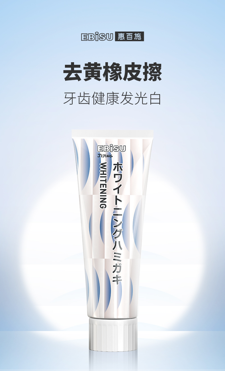 这款EBISU 惠百施 瓷感炫白牙膏,规格:100g,称为去黄橡皮擦,添加药鼠尾草精粹,舒缓不适,抗炎消肿,促进细胞再生,焕活损伤牙龈;含有的蓝桉叶精粹,可以抵御有害菌群,长效滋养;另外含有黄春菊、辣薄荷、光果甘草、库拉索芦荟等有机植物精粹,和双效炫白因子,高效祛除污垢色渍,温和洁白,不伤牙釉质,滋养牙周,6天减少牙龈出血,14天告别牙周肿痛,35天重现粉嫩牙周。