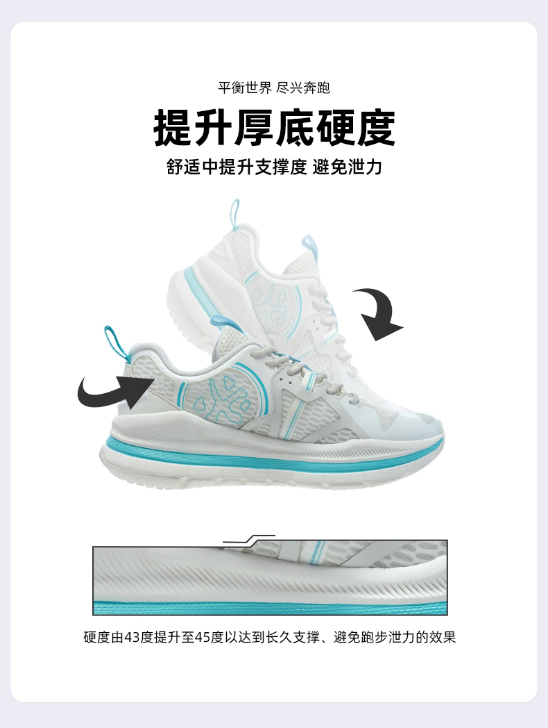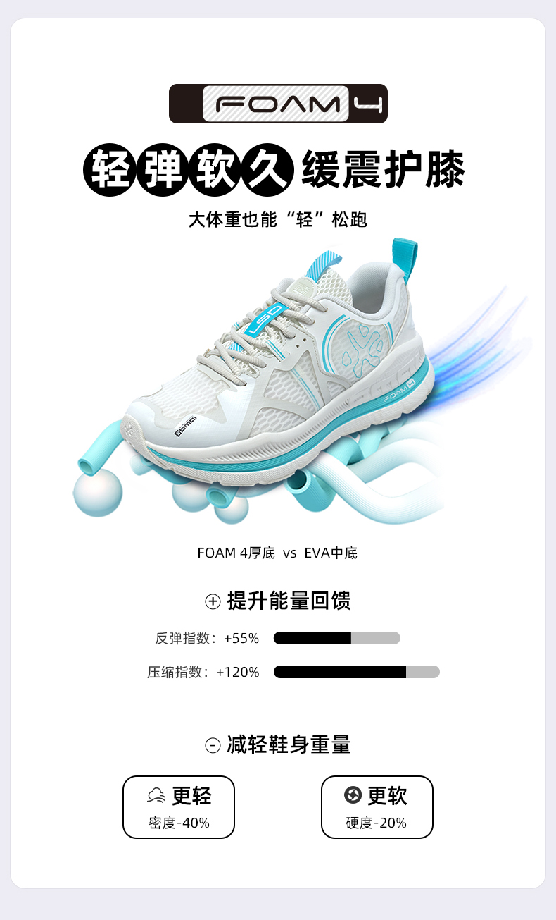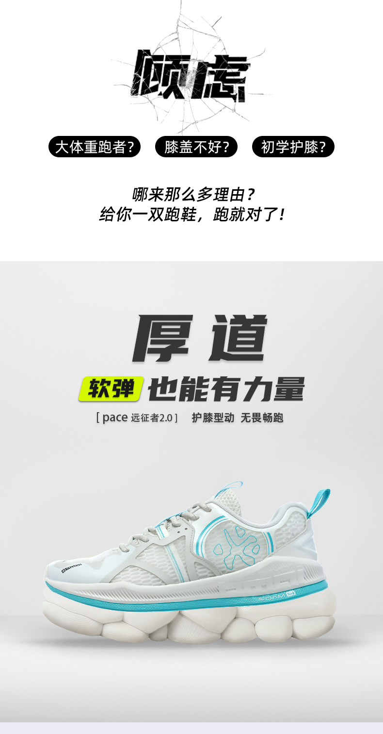 必迈Pace抵御者,是为大体重用户设计的长距离慢跑鞋,使用由超轻配方EVA缓震材料制成的FOAM 4全新科技中底,中底全掌比平常跑鞋厚约1cm,提供轻量优秀的缓震性能,大大缓解了膝盖与脚踝压力。