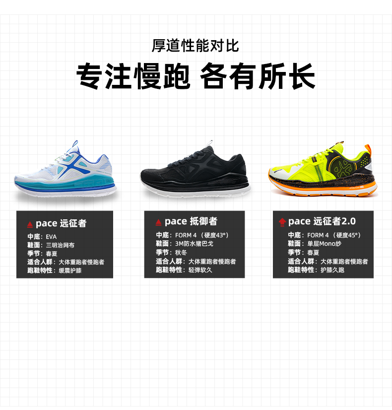 必迈Mile跑鞋追求更快更远,而远征者追求更厚更稳,为长距离慢速跑步与远足设计,经过大体重和腿短步小的跑者实际测试,适合每周跑步距离在30—60公里,配速在6分钟以下的大体重跑者。