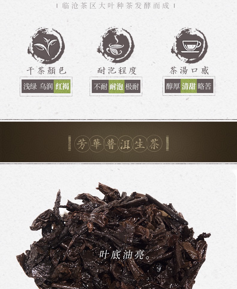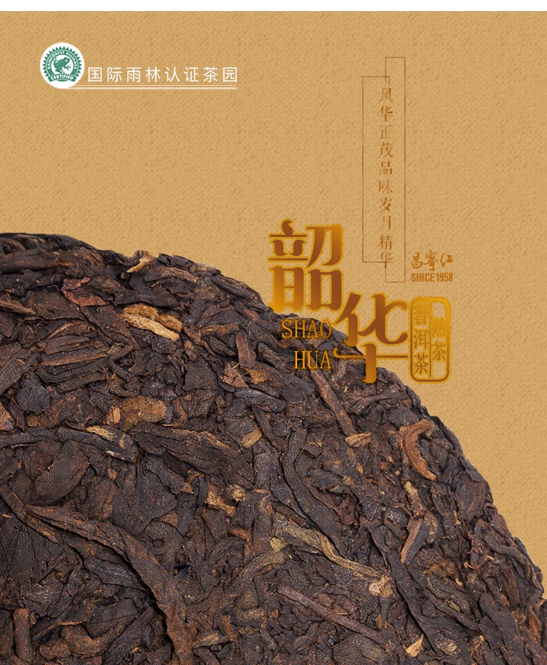 这款普洱茶产地为云南昌宁,由临沧茶区大叶种茶发酵而成,茶饼紧结;茶汤红褐通透,口感清甜温厚,陈香浓郁;叶底油亮,数泡仍有余香。规格:200g。