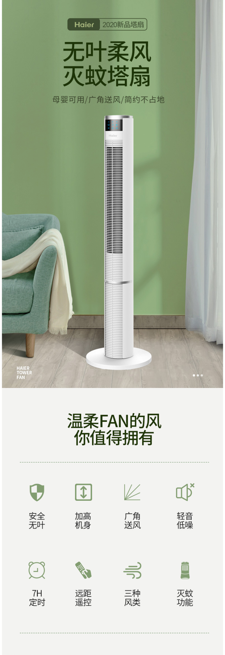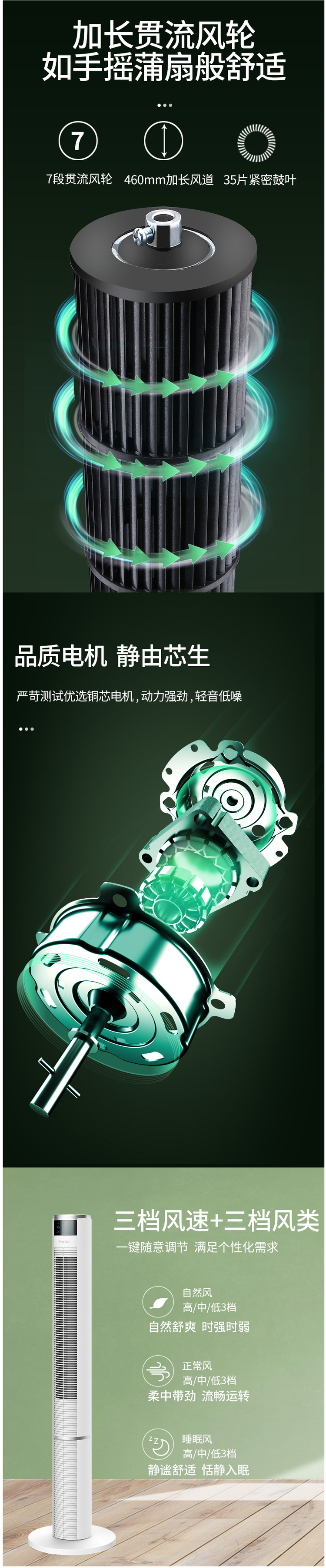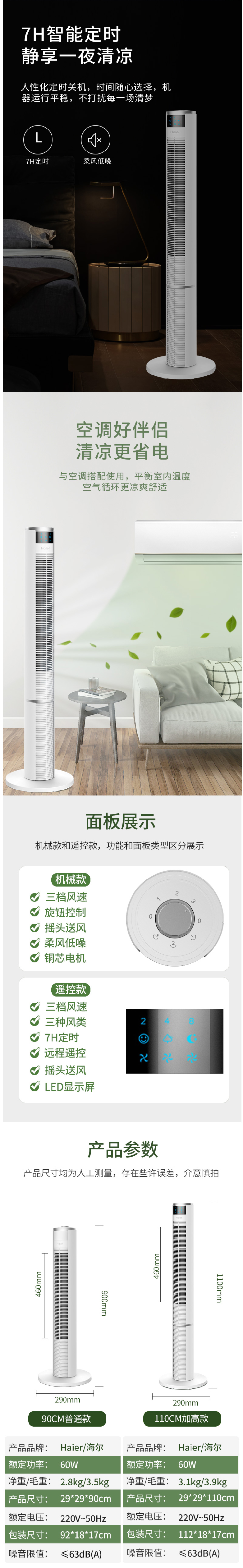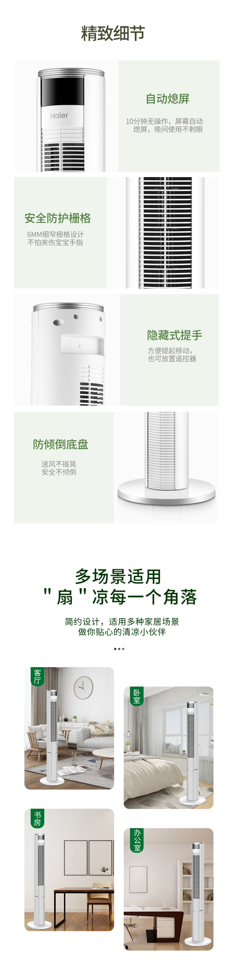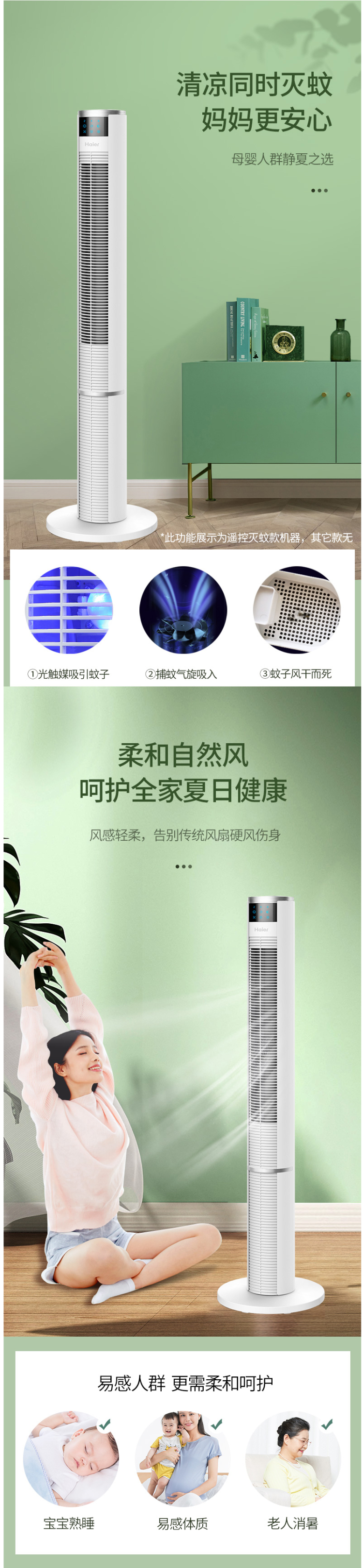 这款海尔 落地无叶静音塔扇,1.1m加高机身,35片紧密鼓叶,搭配7段风轮,460mm加长贯流送风道,能切割多数气流,将风做到细腻的程度,柔风不吹人。