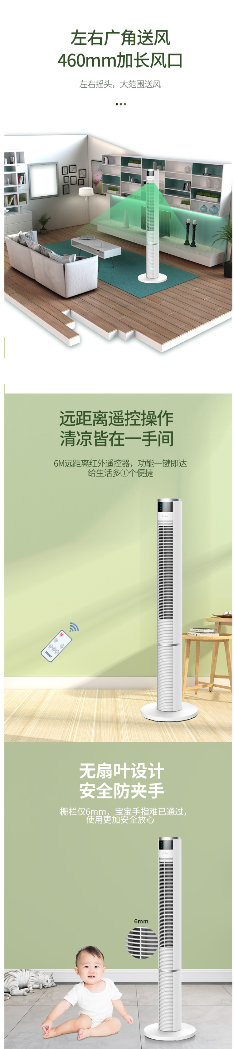 自然风/正常风/睡眠风三种不同的风类,搭配低、中、高三档风速,满足不同人的不同需求;460mm加长风口,左右广角大范围送风。出风口栅栏仅宽6mm,防止宝宝手指进入。