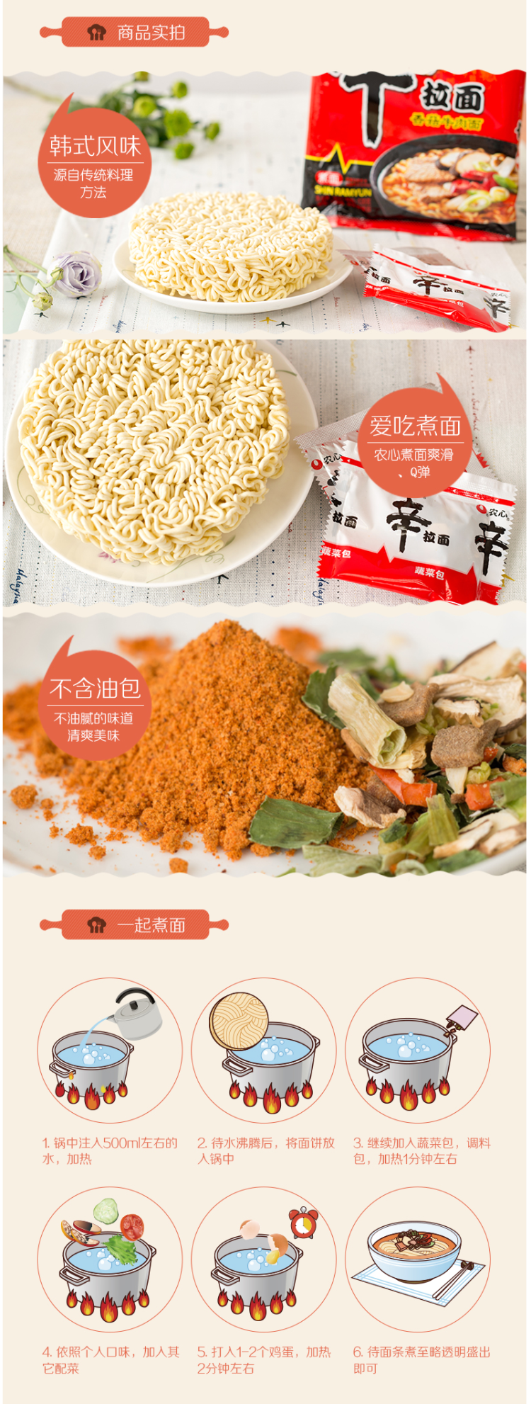 农心拉面隶属于韩国农心集团,是韩国著名的食品品牌。说起农心,大家最耳熟能详的莫过于他家的辛拉面了,面条耐煮弹滑,无油包清爽不腻,搭配传统韩式浓汤、热风干蔬菜包,还原食材本味,营养美味。