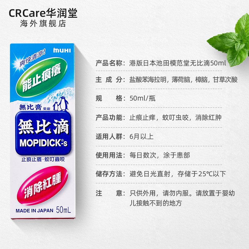 池田模范堂「官网」 无比滴是日本最畅销的液体蚊虫叮咬治疗药。本品快速地渗入骚痒部位,可迅速止痒,对肿胀、红肿有很好疗效。使用起来感觉清爽不油腻的,带有温和香草味。不脏手的涂布栓瓶口,开盖后,将瓶的头部在皮肤上按压几次,让药液充分渗透到胶头部后,可以快速涂抹,使用非常方便。
